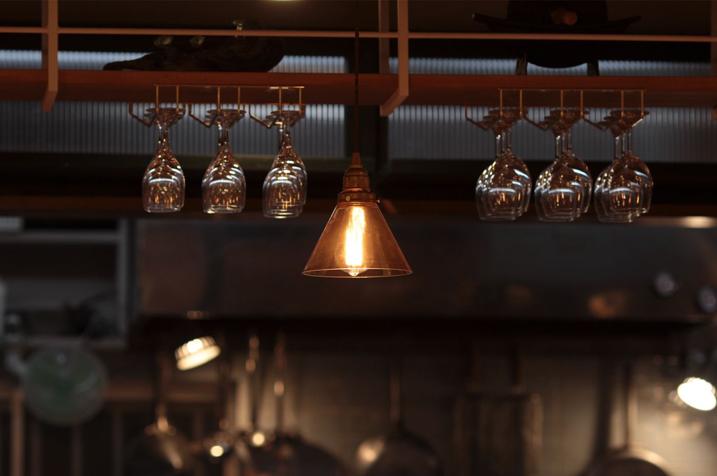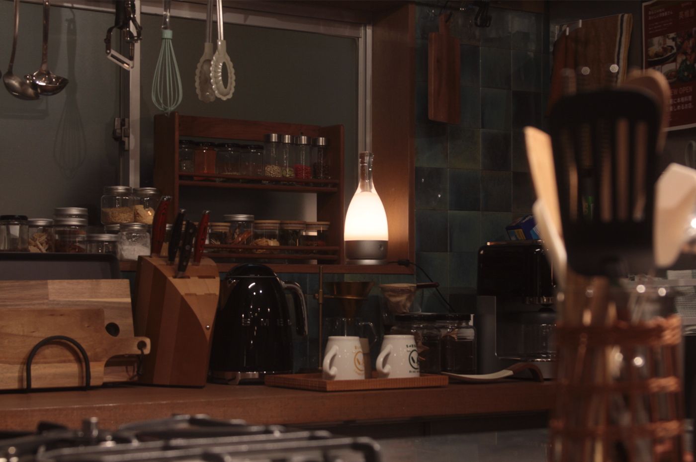 料理人らしくたくさんの調味料やキッチングッズが並ぶキッチンには「ボトルド コードレスLEDランプ」。