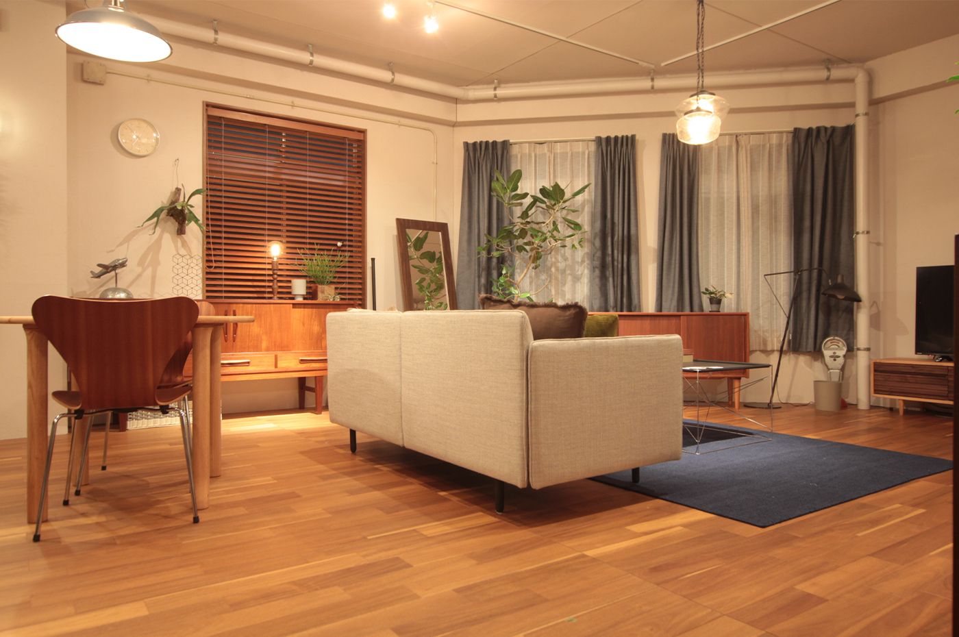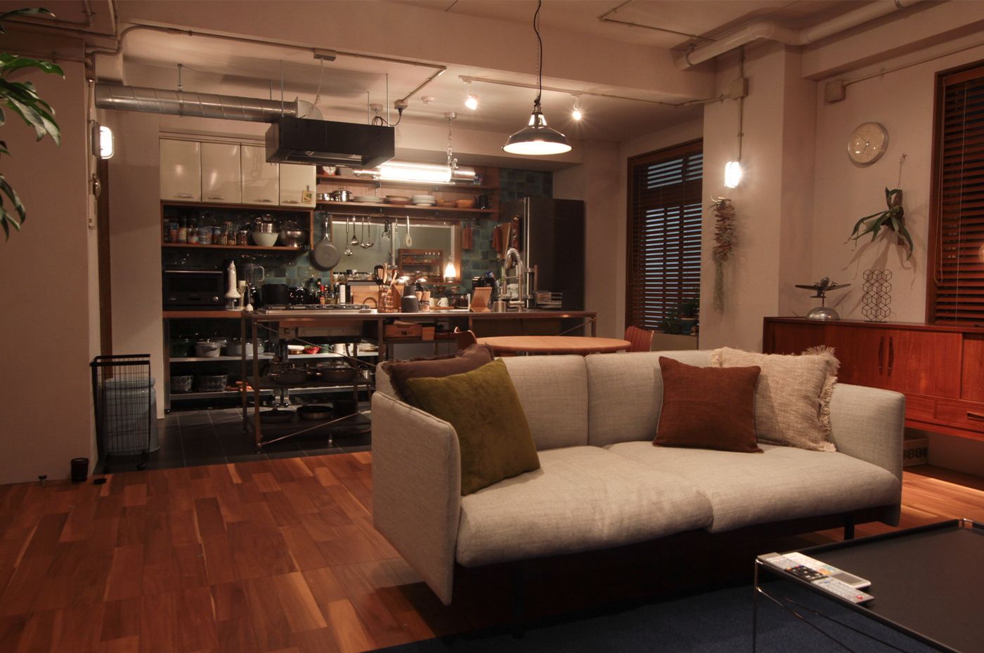 広々としたリビングダイニングは木の家具を中心に温かくナチュラルなテイスト、キッチンスペースはステンレスやアイアンなどが目立つ無骨でクールな印象に。同じスペースでも空間ごとに雰囲気が分けられていて素敵ですね◎
