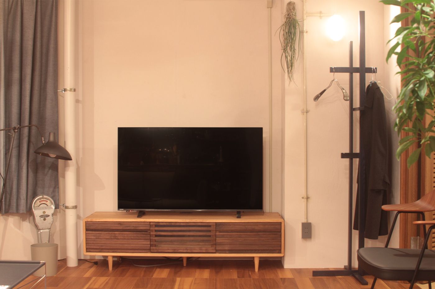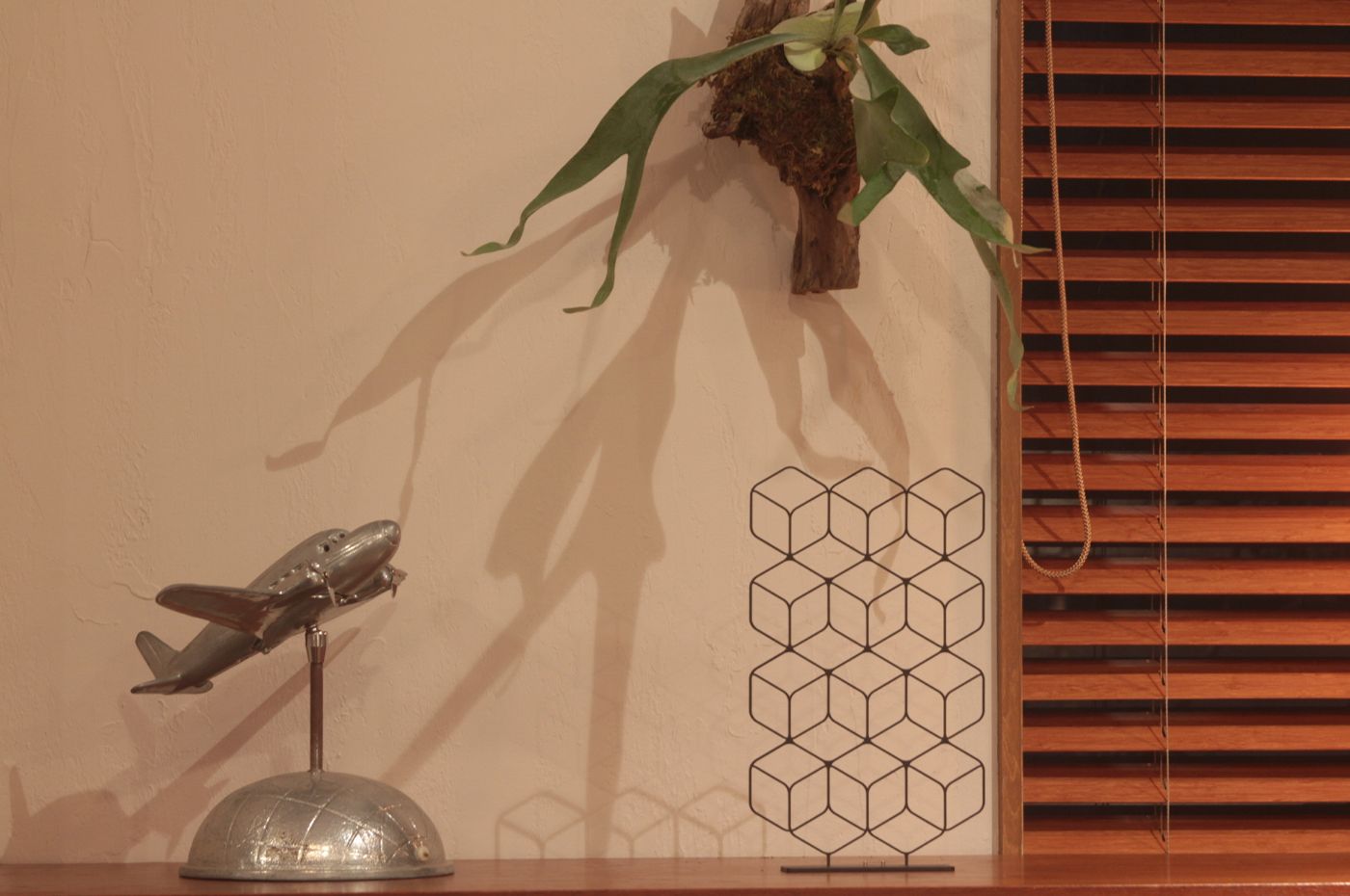 一見シンプルなこのコートハンガーは、それぞれ長さの違う木のパーツで組み上げられているので、見る視点によって形が違って見えるのが特徴です。濃いインディゴ色の塗装がお部屋のいいアクセントになってますね!