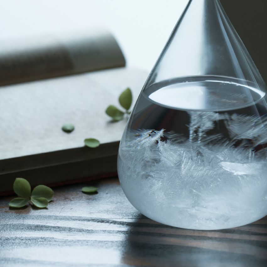 中に入っている液体は、クスノキのエキスやエタノールなどの複数の化学薬品。この液体が天気によって結晶を作り、その結晶が浮かび上がったり、沈殿したりと変化を見せます。