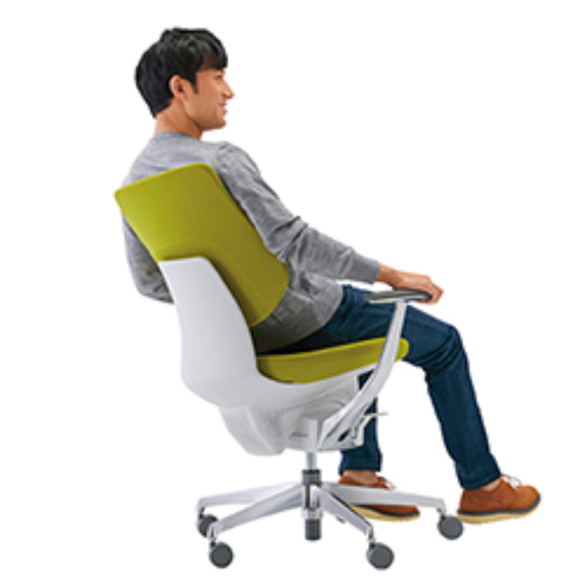 多くのオフィスチェアは背のリクライニングをするとき、背の部分だけが倒れる構造になっております。それに対してデルフィチェアは、座面と背の部分がシンクロ(連動)してリクライニングする構造になっています。