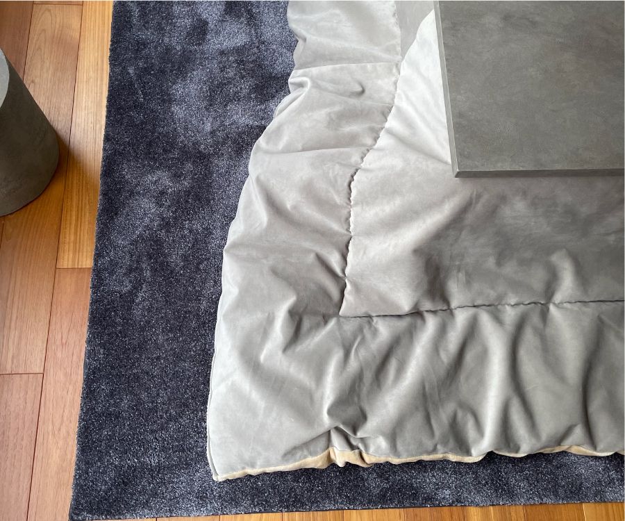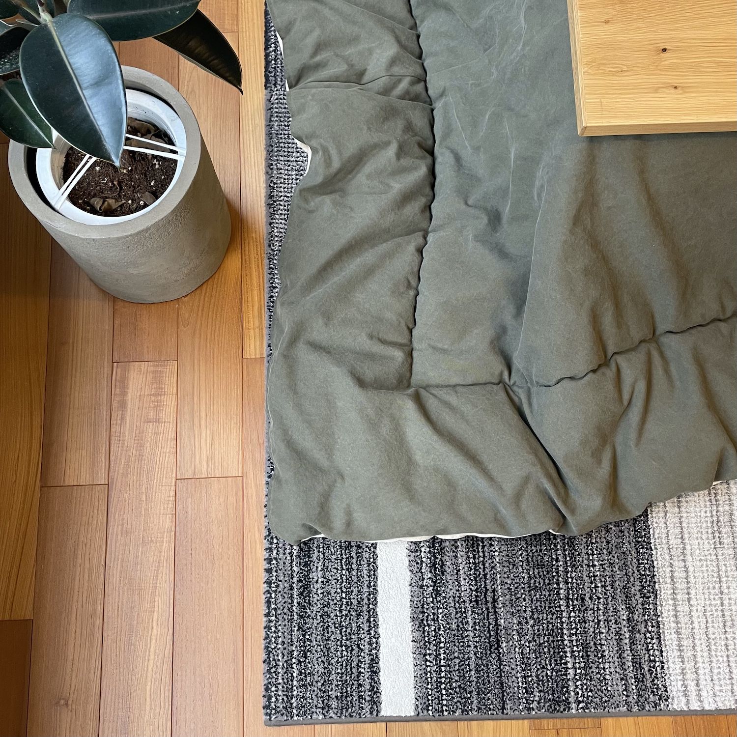 こたつの野暮ったいイメージを覆す、モダンでシックなこたつ布団を求め、オリジナル製作しちゃいました。選んだのはウール混のヘリンボーン生地。モダンにもカジュアルにも合わせられる万能選手。元々ソファや椅子の張地として使われている生地なので、耐久性は抜群。インテリアにも難なく馴染みます。(ラグ:ピサ/ニッケル 200×250㎝)
