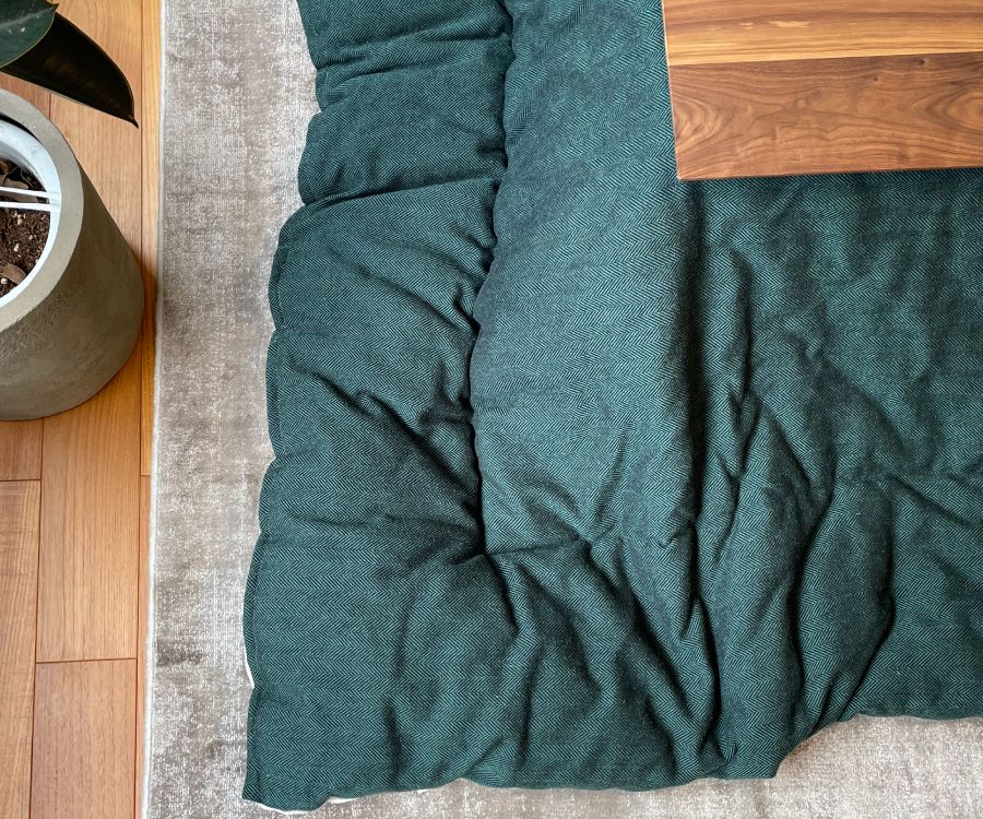 こたつの野暮ったいイメージを覆す、モダンでシックなこたつ布団を求め、オリジナル製作しちゃいました。選んだのはウール混のヘリンボーン生地。モダンにもカジュアルにも合わせられる万能選手。元々ソファや椅子の張地として使われている生地なので、耐久性は抜群。インテリアにも難なく馴染みます。(ラグ:ブロードウェイ/アンスラサイト 170×250㎝)
