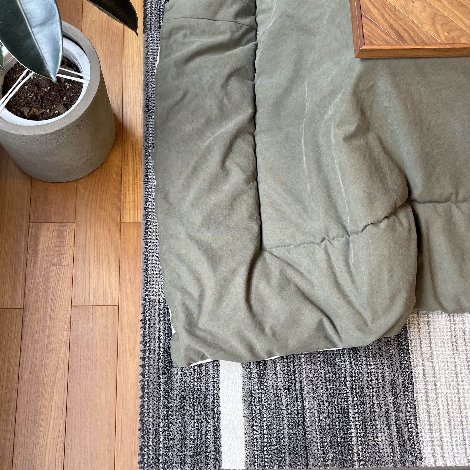表地はありそうでなかった!?ヴィンテージ感のある帆布を使用。国産のしっかりした8号帆布に洗いをかけ、アタリを出した風合いのある生地です。キルトステッチを必要最低限にとどめ、直線的に縫うことでシンプルに仕上げました。セットこたつ布団としてお選びいただけるカラーは【カーキ】と【ベージュ】の2色。ヴィンテージテイストのこたつとも相性抜群です!(ラグ:インフィニティ 200×250cm)