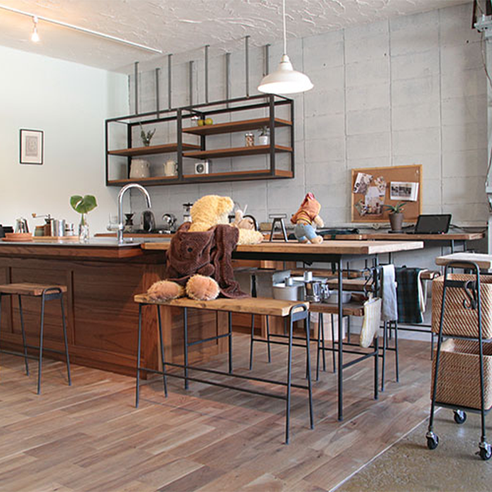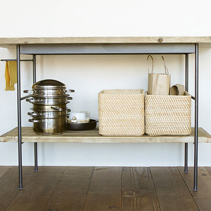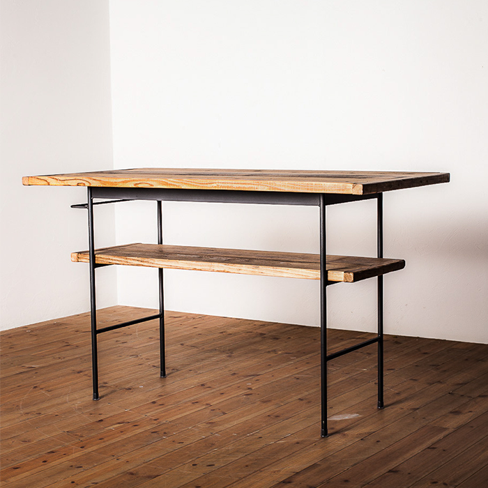 使い込まれた“風”ではなく、実際にしっかりと使い込まれた足場板のラスティな雰囲気がテーブルの品格を感じさせる逸品。足場板はそれぞれ木目や色味、キズ、割れの状態が一枚一枚異なるため、こちらも世界で一つのテーブルとして楽しんでいただけます。