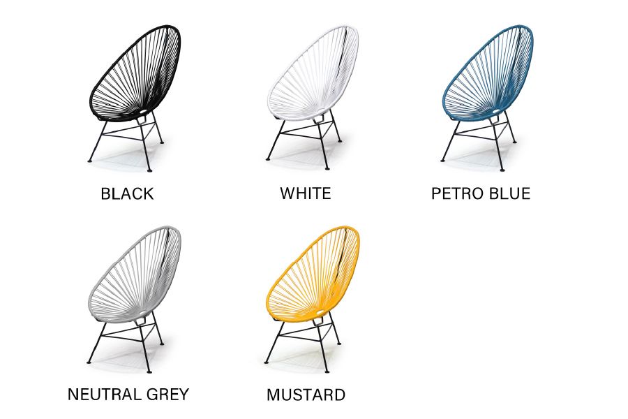 アカプルコチェアは、頭まですっぽり埋まる背もたれが身体をしっかりと支え、その見た目と反して柔軟性のあるPVCコードが身体を包み込んでくれるので、座っても痛くありません。丸みを帯びた扇型の座面が気持ちよく体にフィットします。