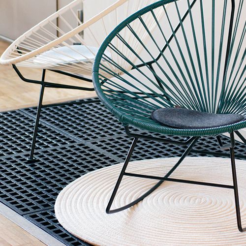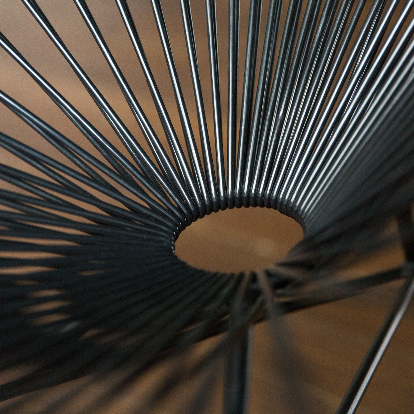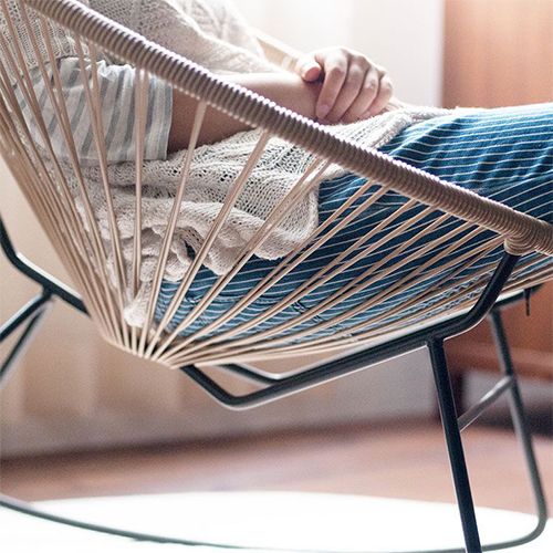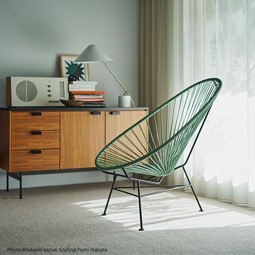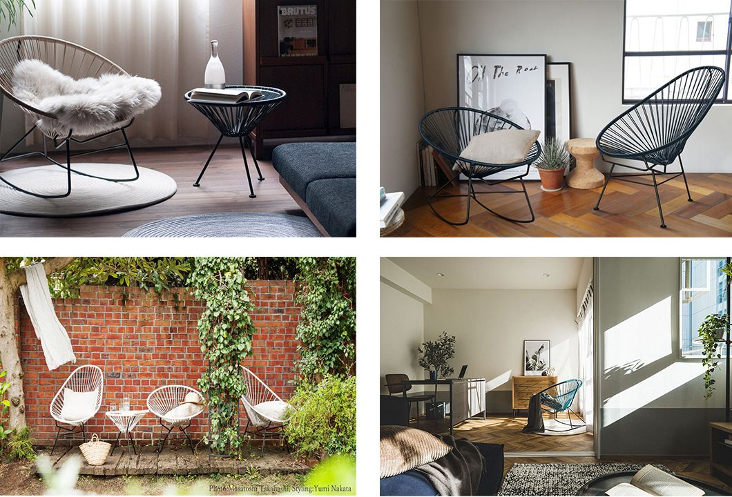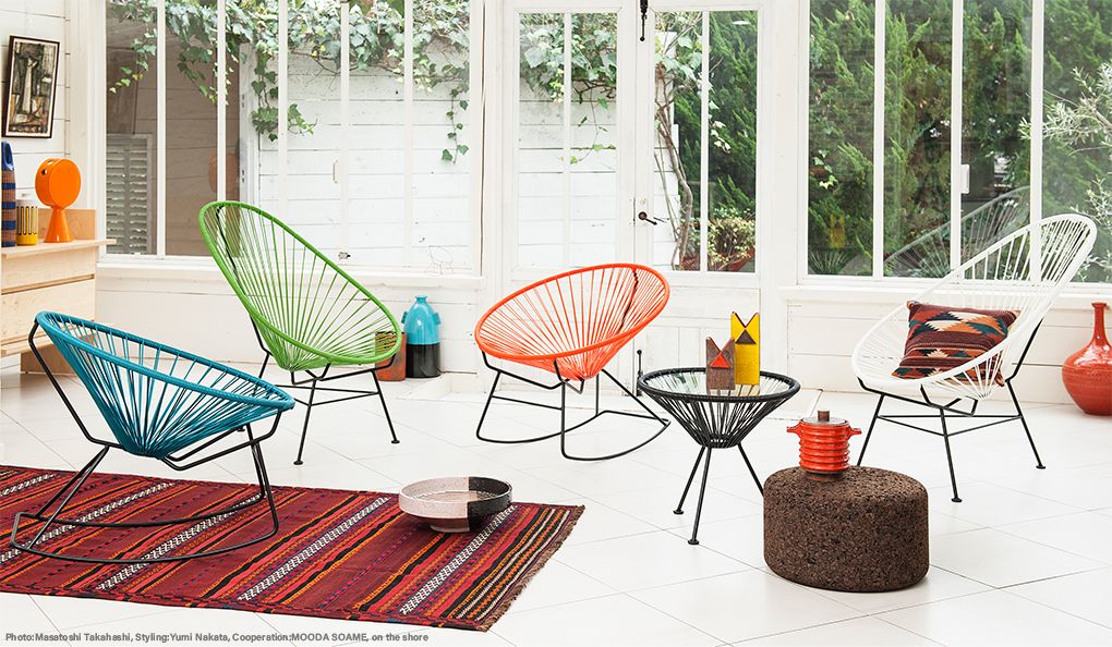 そしてメトロクスのアカプルコシリーズは、屋内でも使いやすいように様々な工夫がされています。例えばメキシコのチェアに比べ、日本人の住環境や体格に合わせてサイズがリデザインされていたり、放射状に張られたコードが透けたデザインのため、小さなお部屋の中でも圧迫感なくお使いいただけます。