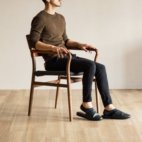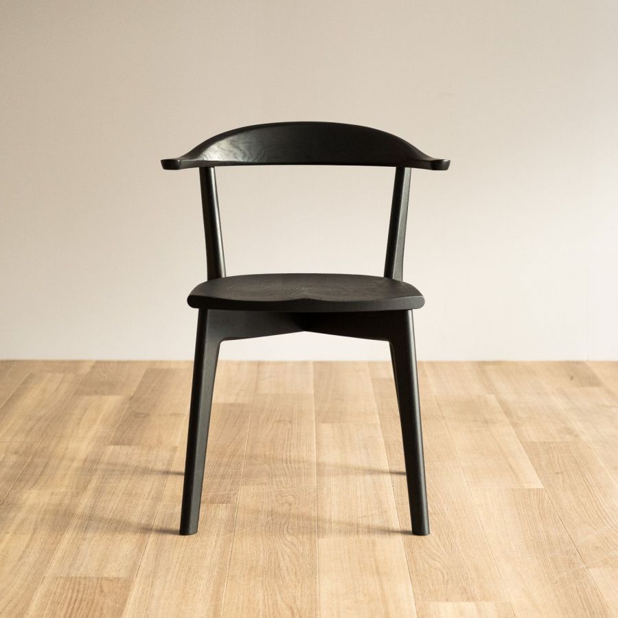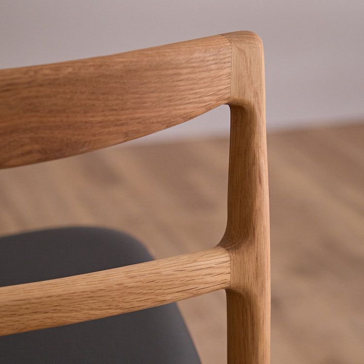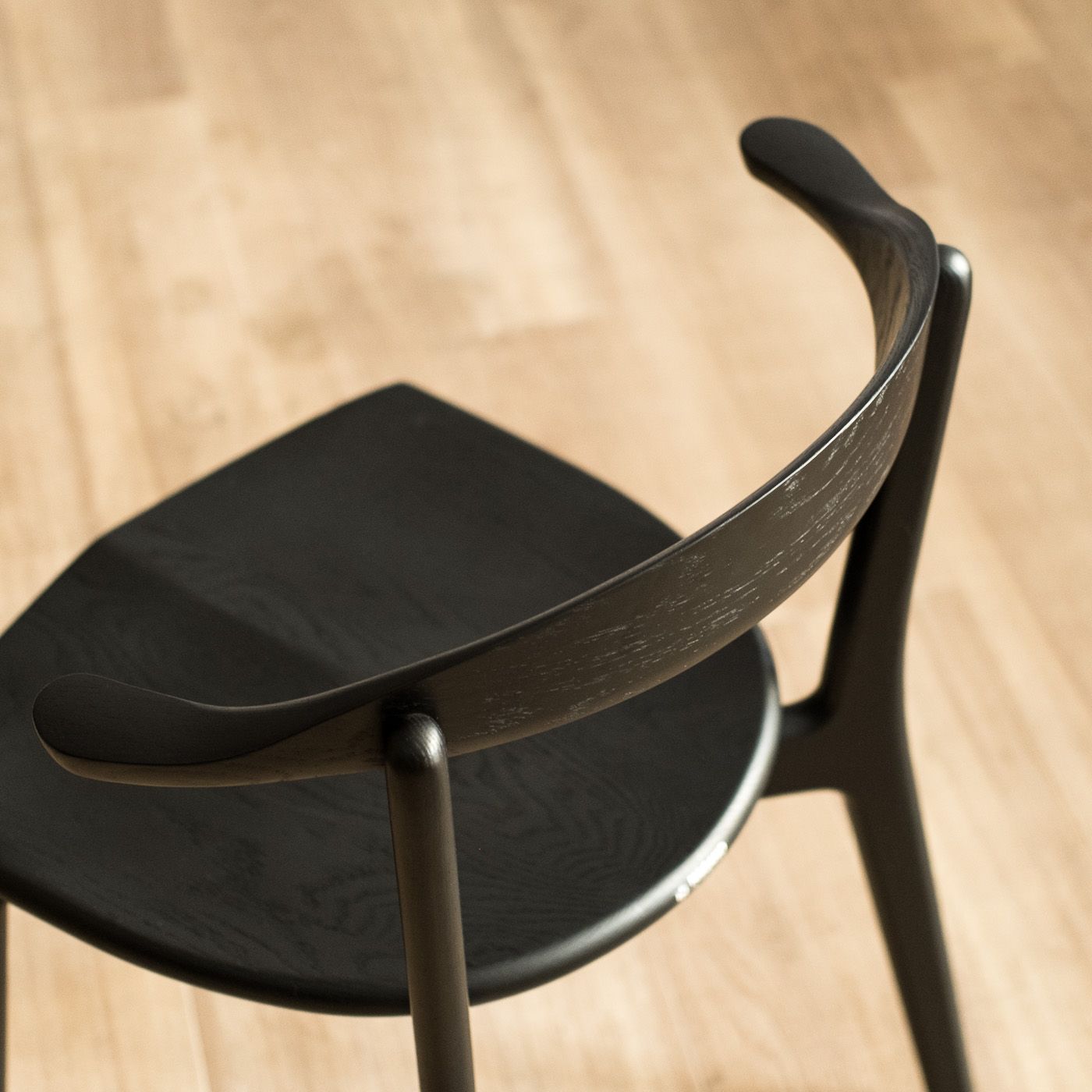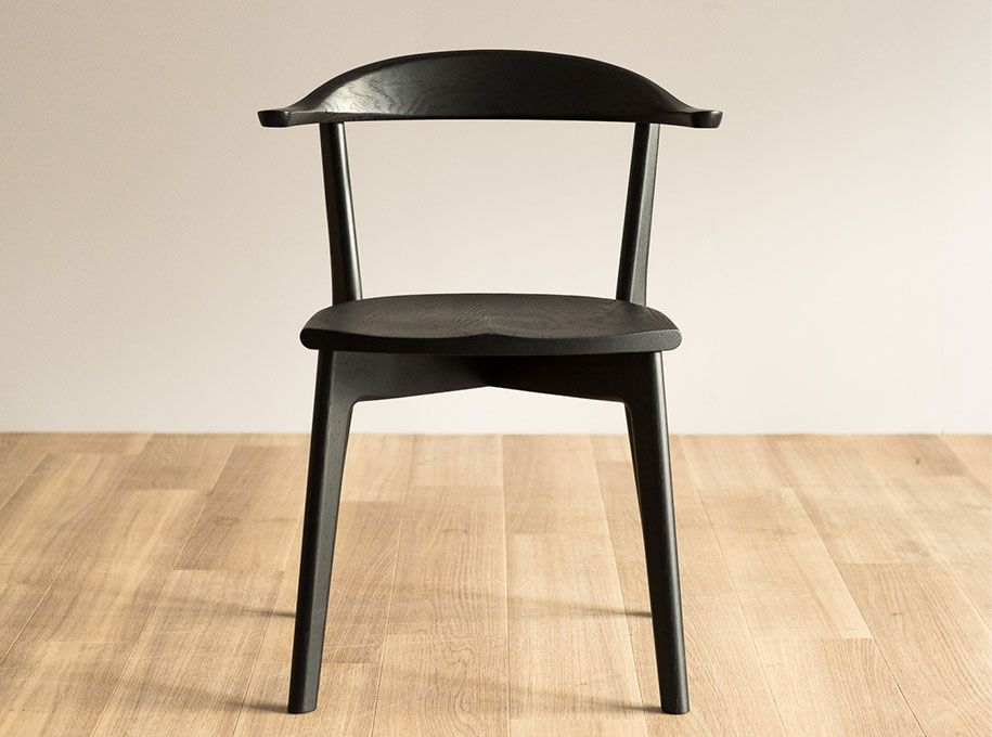 チェアは基本的にダイニングテーブルに合わせて使うので、実は普段、後ろ姿しか目にしません。だから、【ROUNE】は後ろ姿の美しさにこだわってデザインされました。2本の繊細な背もたれは緩やかな弧を描いたのち、流れるように滑らかなアールで後脚に接続。優雅さと一体感を印象付けています。