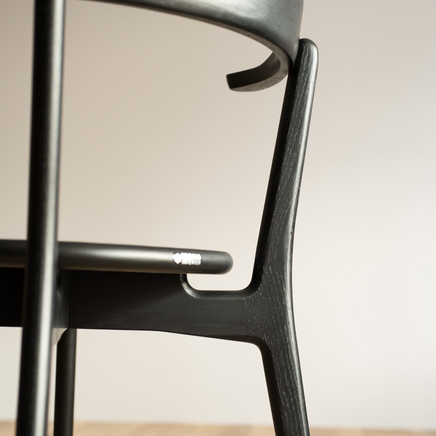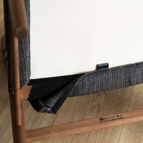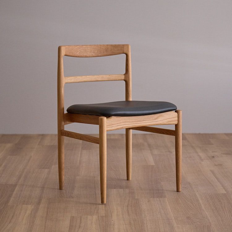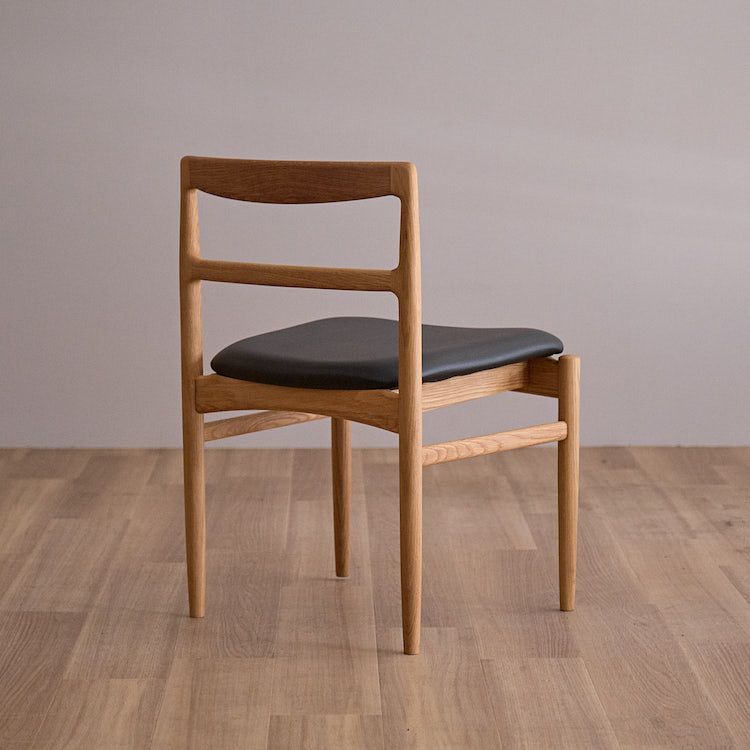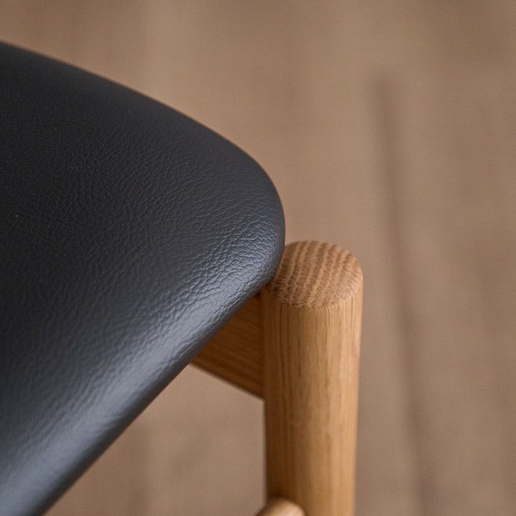 座面はブラックのPVCを張り込んでいます。PVCは耐久性や防汚性に優れるとともに、ファブリックや本革と違って水拭きでき、中性洗剤の使用もOK。ブラック張地は周りの家具にも合わせやすく、ウォールナット材だと落ち着いた印象、オーク材だとナチュラルな印象、ブラック塗装だとスタイリッシュな印象と、お選びいただくフレームによって与える印象がガラリと変わります。