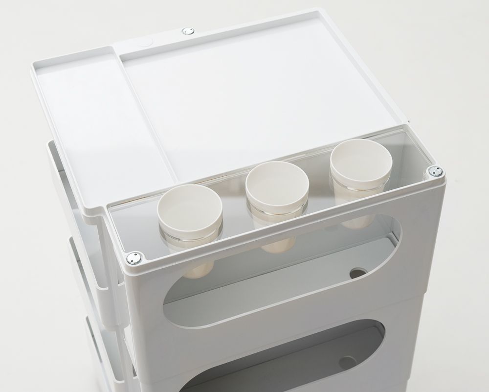 「アクリルプレート」は天板の仕切りをフラットにするためのパーツです。天板をテーブルのようにご使用いただけるので、作業机やサイドテーブルとしての使いやすさが格段に上がります。3つの穴が開いたプレートパーツとそこにぴったりはまるコップがセットになった「アクリルホルダー」は、ワークスペースではペンスタンド、キッチンではカトラリーいれなど、使用する場所に応じて活躍してくれるパーツです。付属のコップを使わなくても、普段お使いのグラスなどを入れればドリンクホルダーとしてもお使いいただけます。「サニカー」はボビーワゴンのサイドポケットをダストボックスとして活用できるパーツです。作業台に収納とゴミ箱まで一体化しているという究極の省スペースが実現しました。