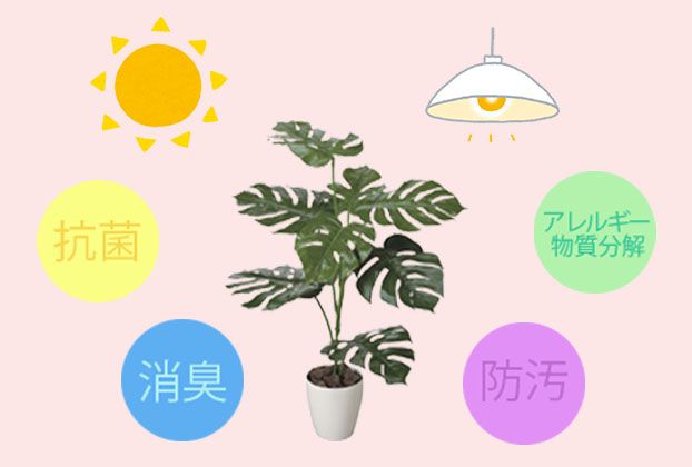 「光の楽園」シリーズは酸化チタン光触媒が施してあるフェイクグリーンで、お部屋にある照明の光や窓から入る太陽光のエネルギーを使って効果を発揮します。