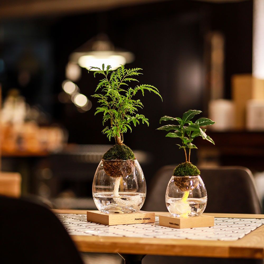 メインの植物と苔玉と水が入った丸みのあるグラスのコラボレーションが