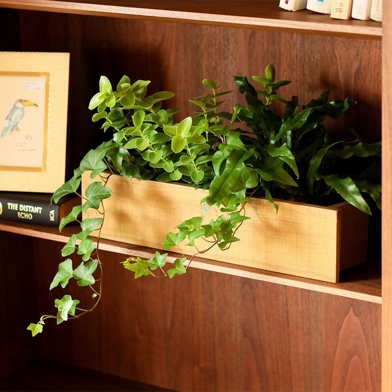横につなげたり、段差をつけたり、中に飾る植物をアレンジしたり、自由自在にお楽しみ頂けます。外枠は天然オーク無垢材に引き目仕上げを施し、木の温もりと深みのある素材感を楽しむことができます。
