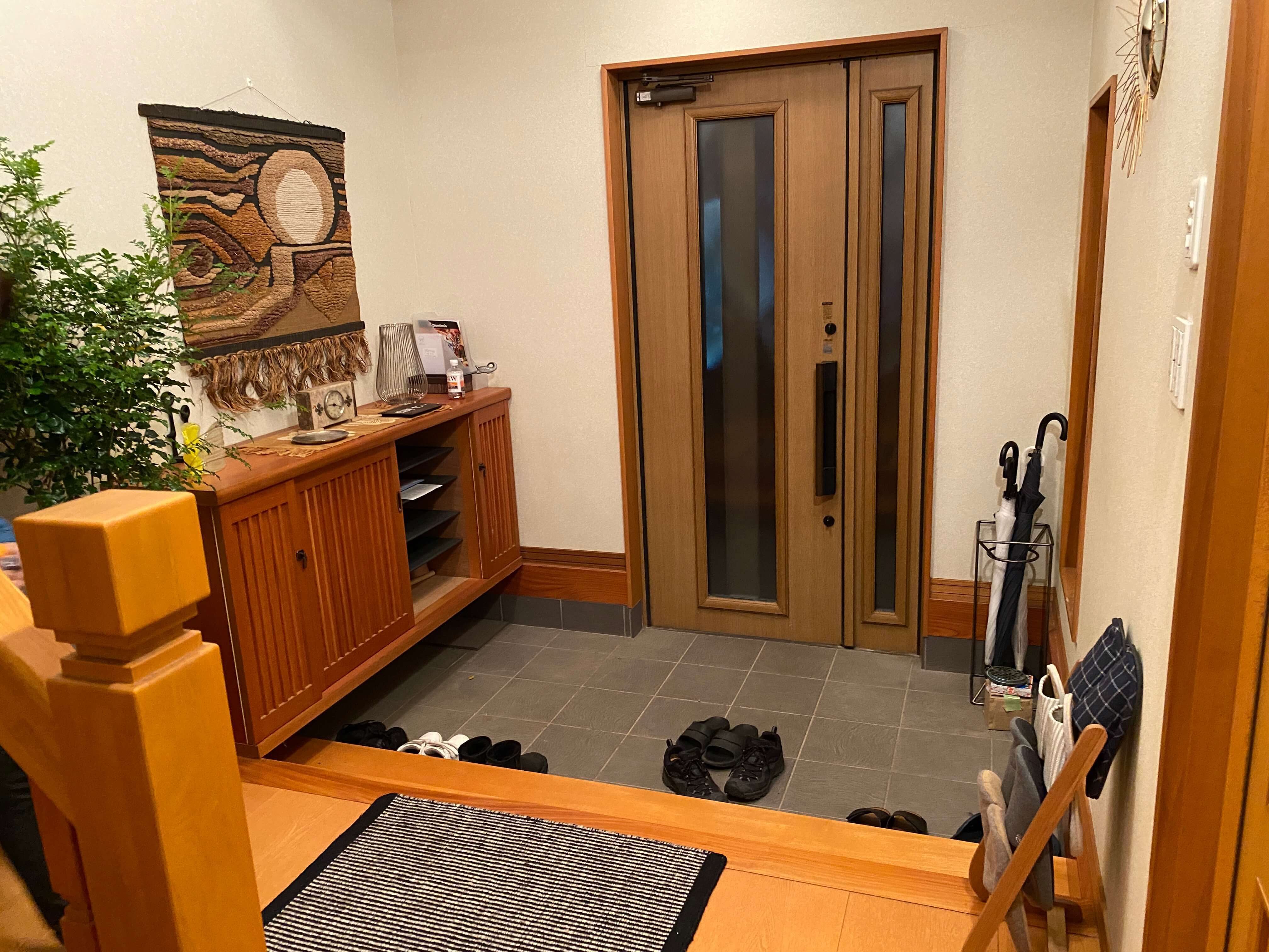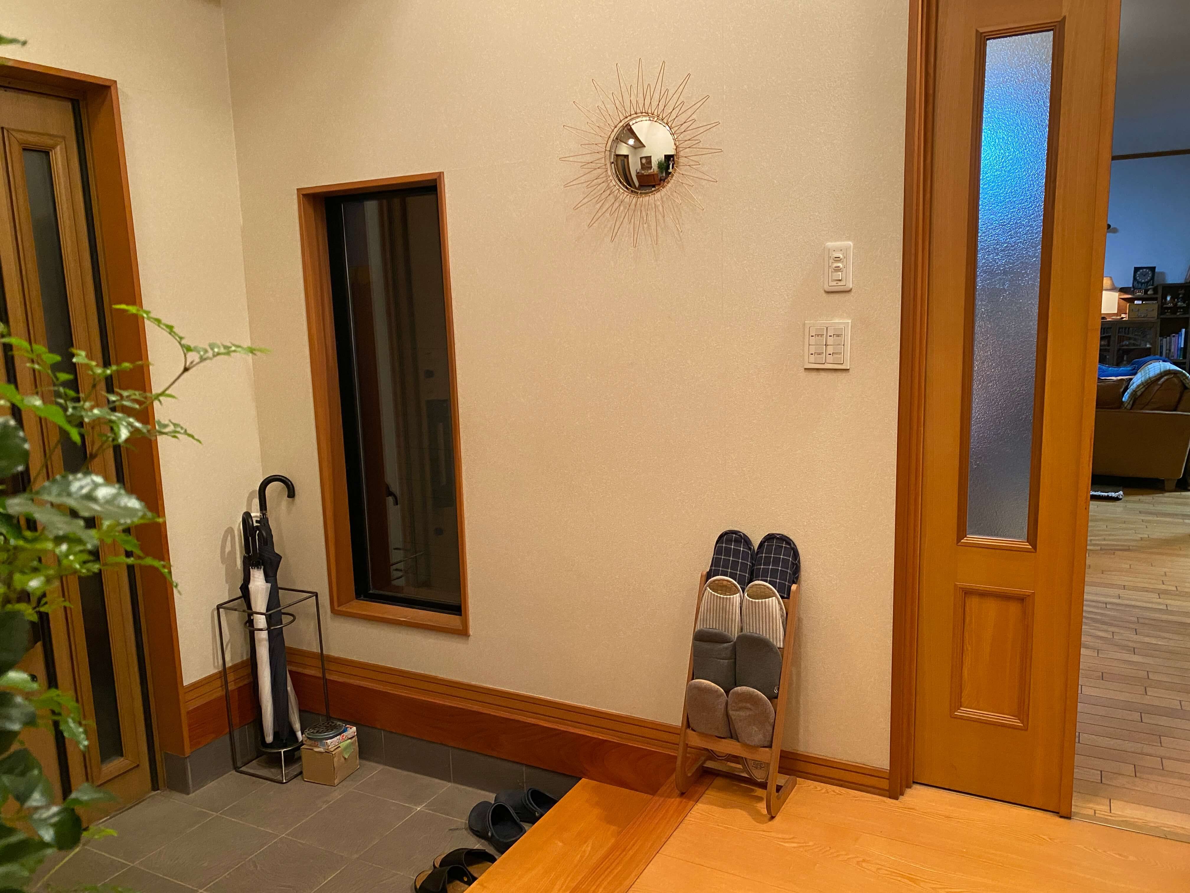 エントランスではデュウ アンブレラスタンドとレイ ウォールミラーがをおうちの顔を素敵に飾ってくれています。