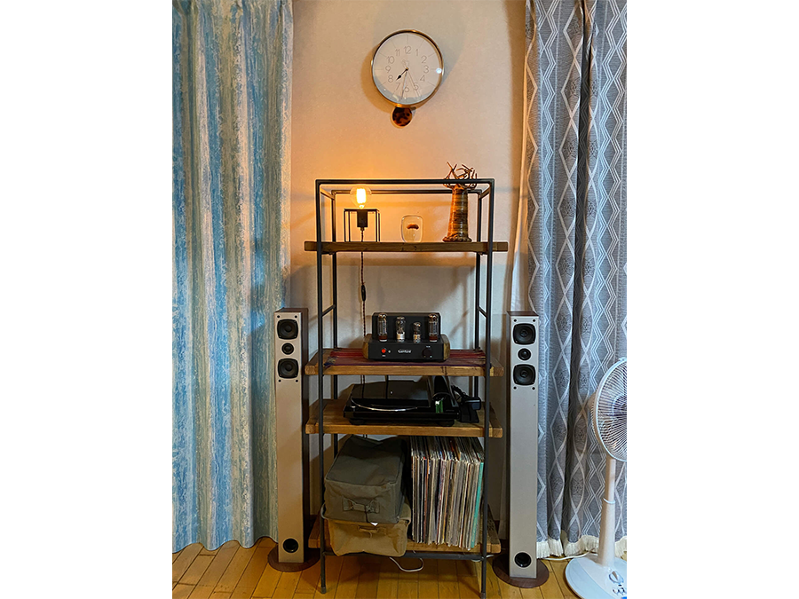 音楽機器類が収納されているのは杉山製作所 ファクト ワークシェルフ