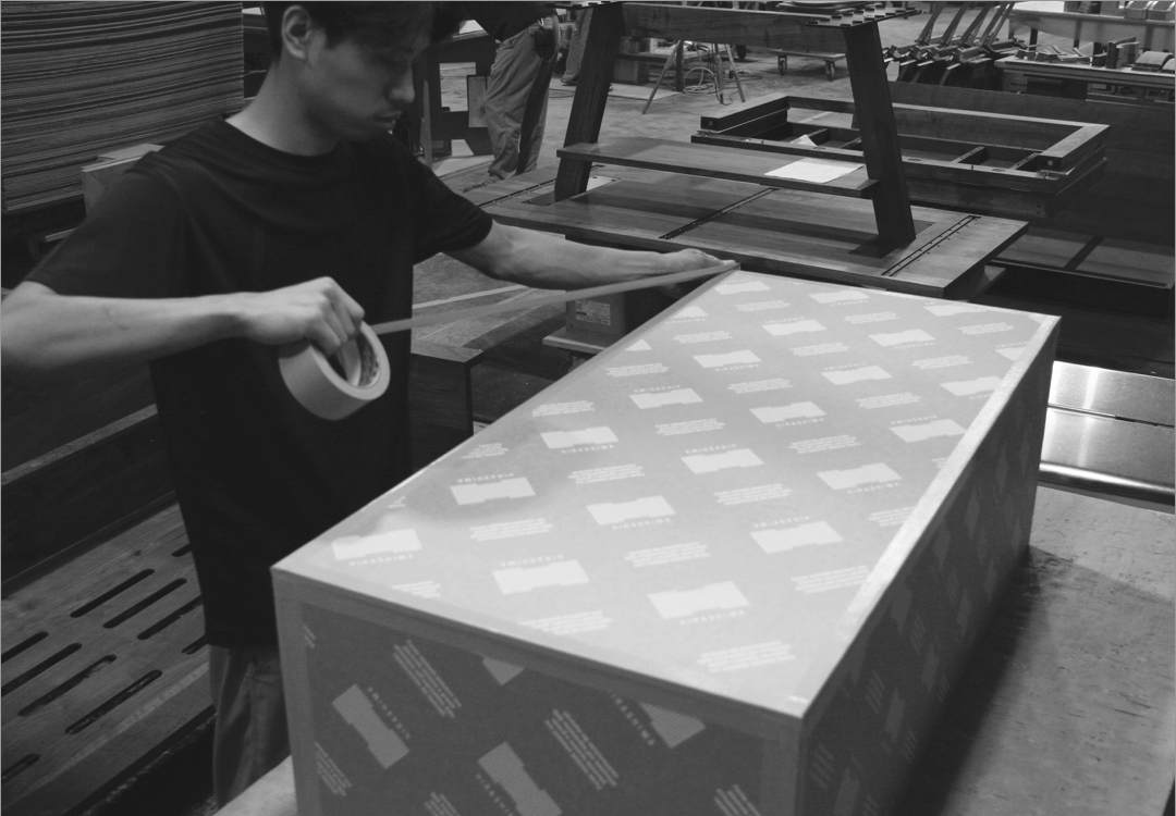 作り上げられた家具が無事に、皆様のお手元に届くように、数ヶ月、楽しみに家具が手元に届くのをお待ちくださった皆様の気持ちにお応えできるように、梱包という大事な作業が。