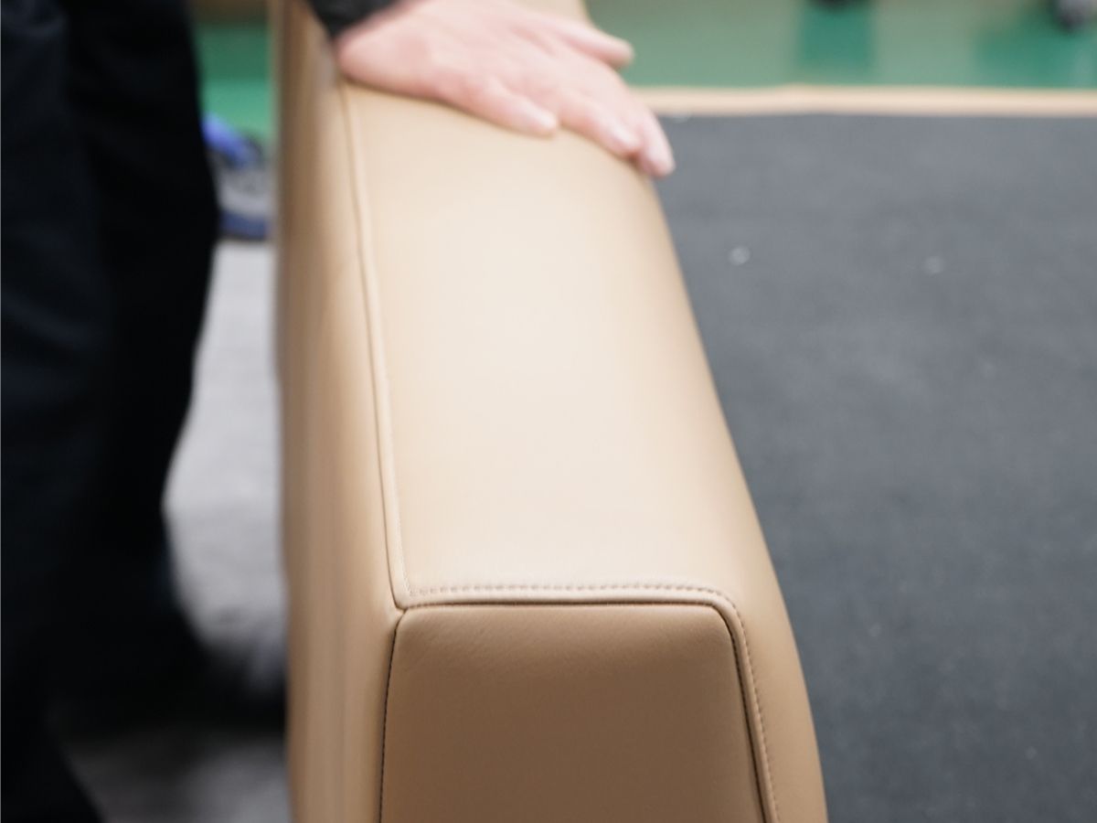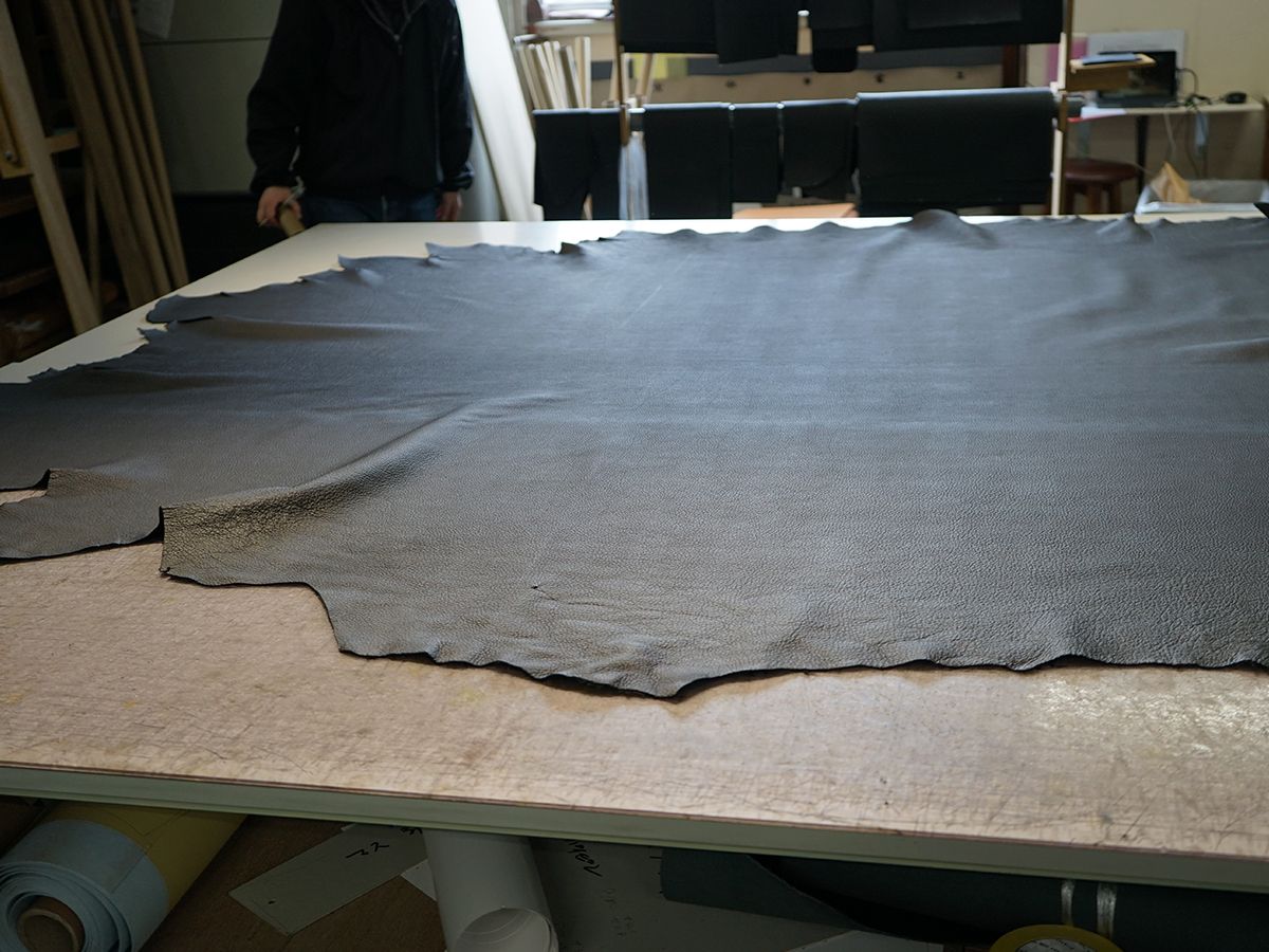 革の裁断は【全て人の手】で行われます。革の特性で、部位よって柔らかさが異なり素材のままでは均一ではないため、場所によって引っ張ったり、叩いて柔らかくし、加工を行いやすくします。ファブリックは素材が均一のため、機械によって裁断されます。