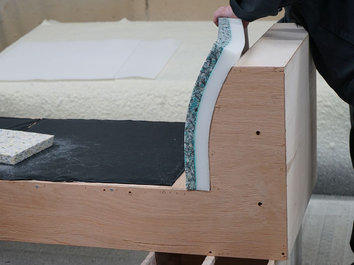 座り心地だけでなく、デザインによっても貼り方や種類を替えられるそうです。パキッとしたイメージや、コロンとかわいらしいデザイン。ウレタンの重ね方によって、見た目の見え方も変わってくるそう。心石さんではソファを長くお使いいただくことを前提とされているので、【ソファのへたり】にも着目し、【密度に高いウレタン】を採用されているそうです。ゴムのりを噴出して隙間なく貼っていきます。