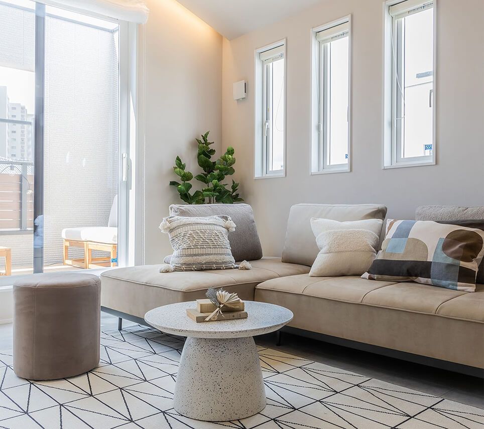 ソファ自体はあくまでベーシックな色に抑え、アクセントを加えたい場合は、クッションなどの小物で取り入れると北欧風モダンらしいバランスに仕上がります。