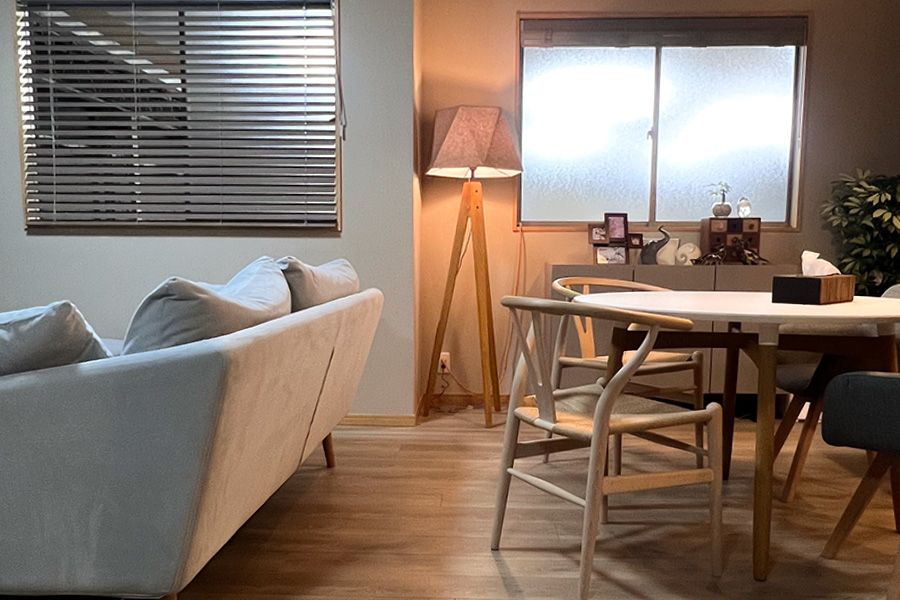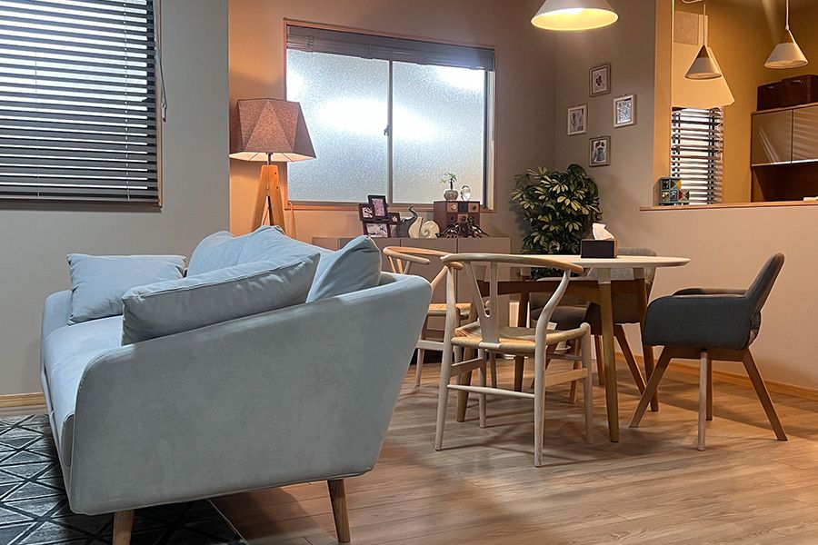 リビングダイニングはホワイトやグレーなどの淡い色の家具に揃えられ北欧テイストな雰囲気です。