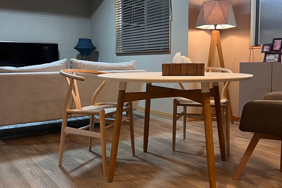 丸テーブル(直径110cm)は座り位置が固定されてないため、コンパクトなお部屋にもおすすめです。