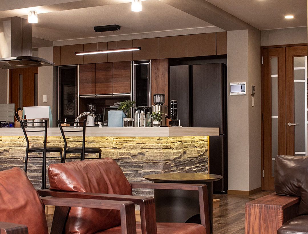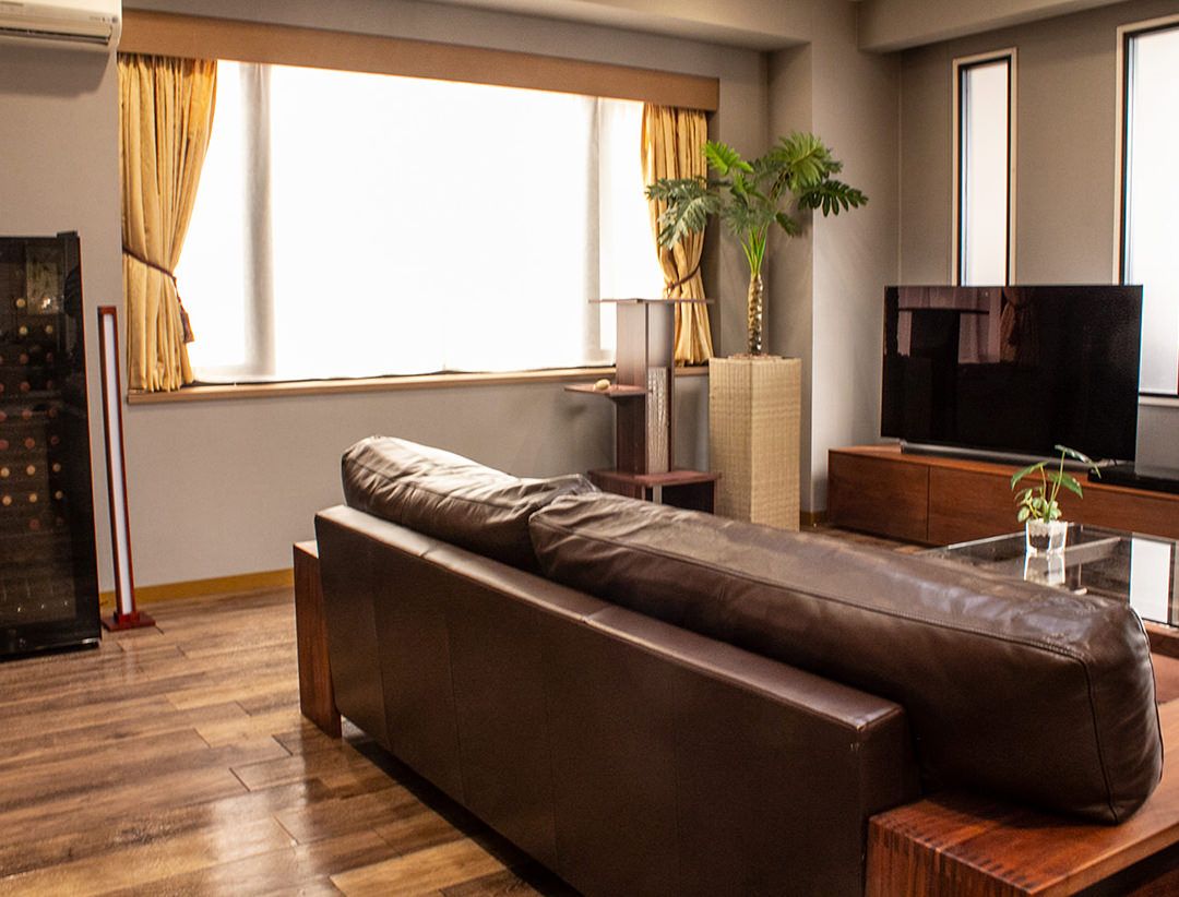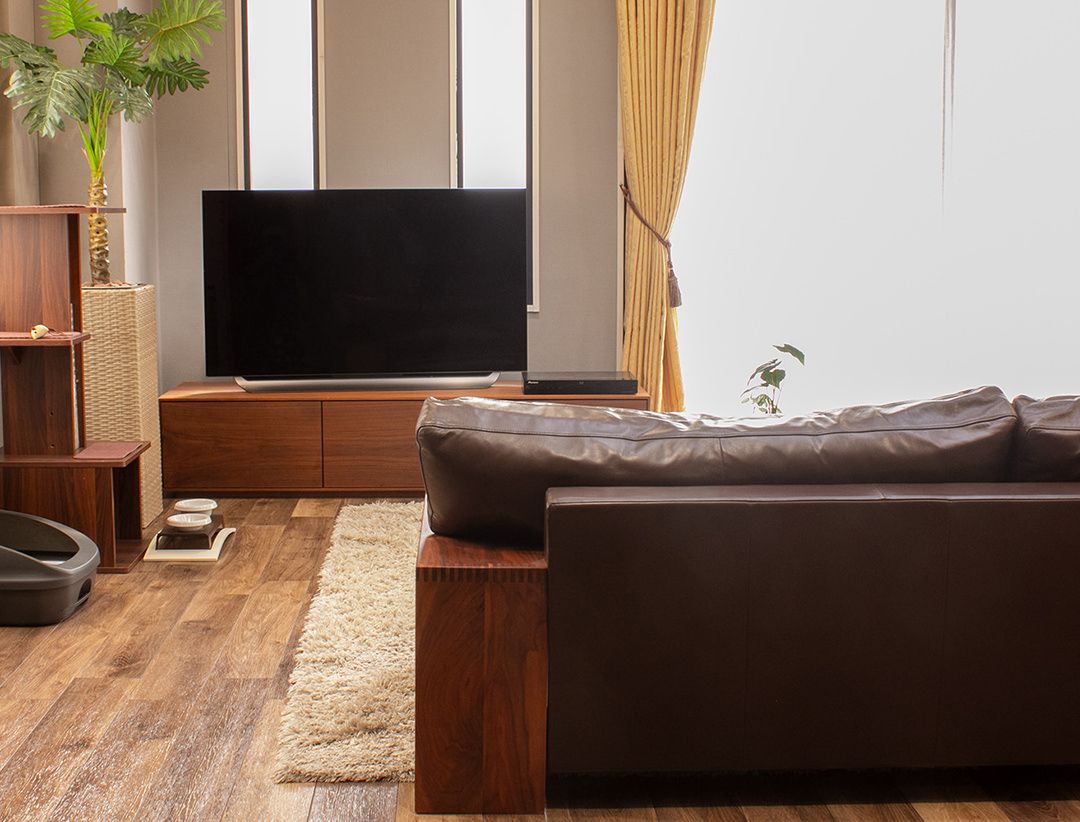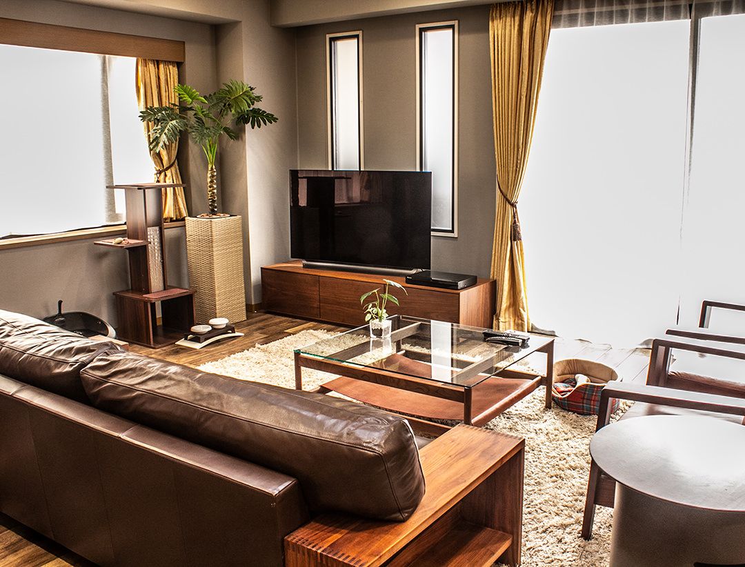 床も家具も全体的にウォールナットが基調になっており、落ち着いた雰囲気にまとめられています。