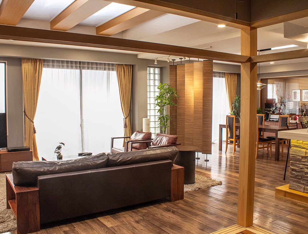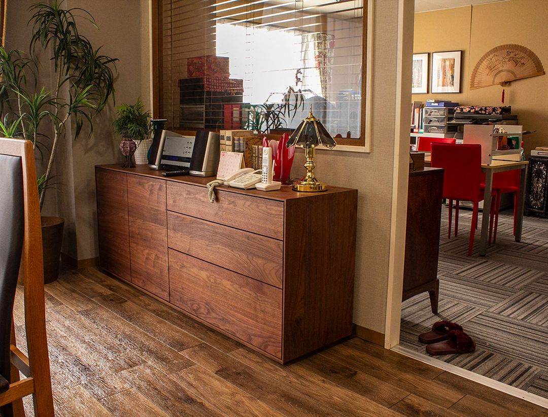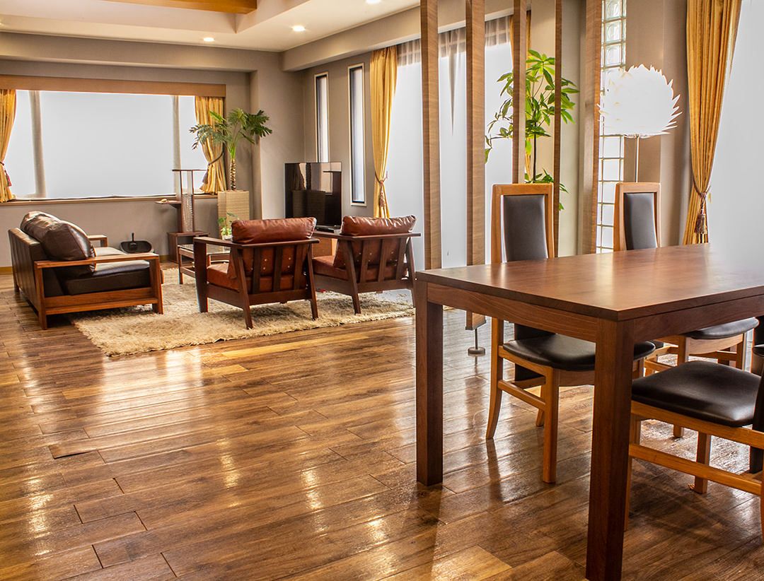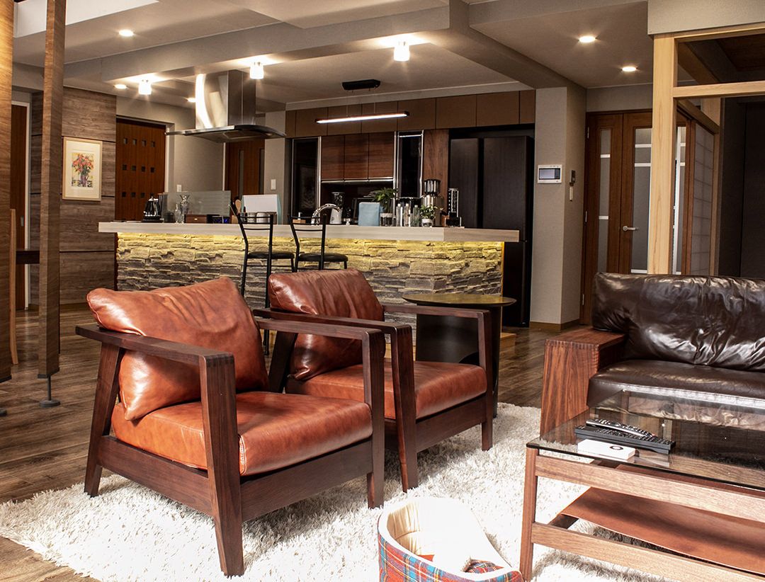 床も家具も全体的にウォールナットが基調になっており、落ち着いた雰囲気にまとめられています。