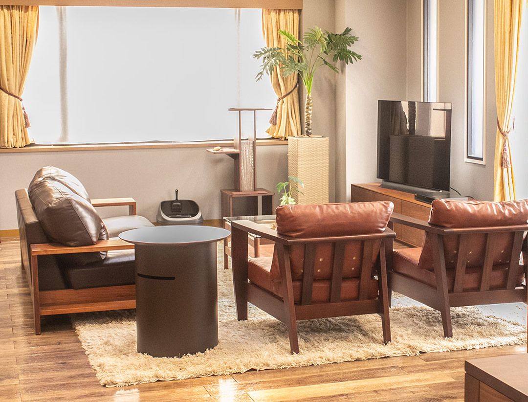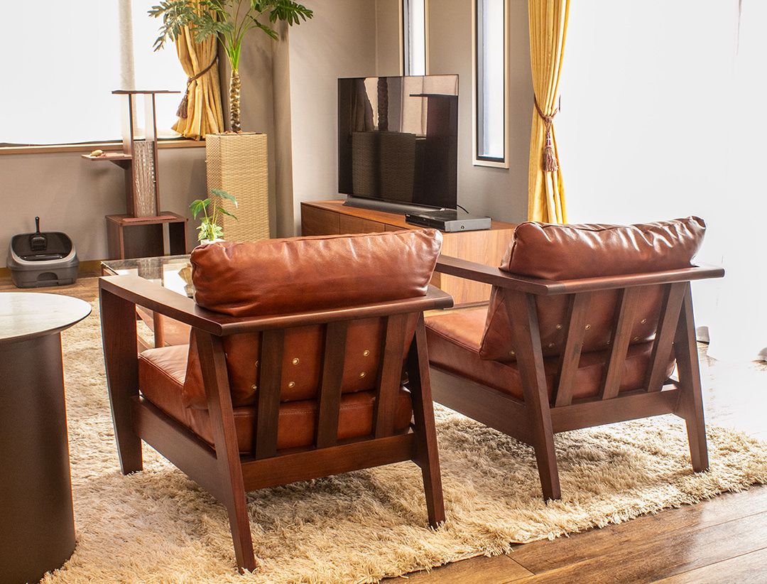 メインのソファはハイグレードレミアニリンレザーを使った『ロバンソファ』。