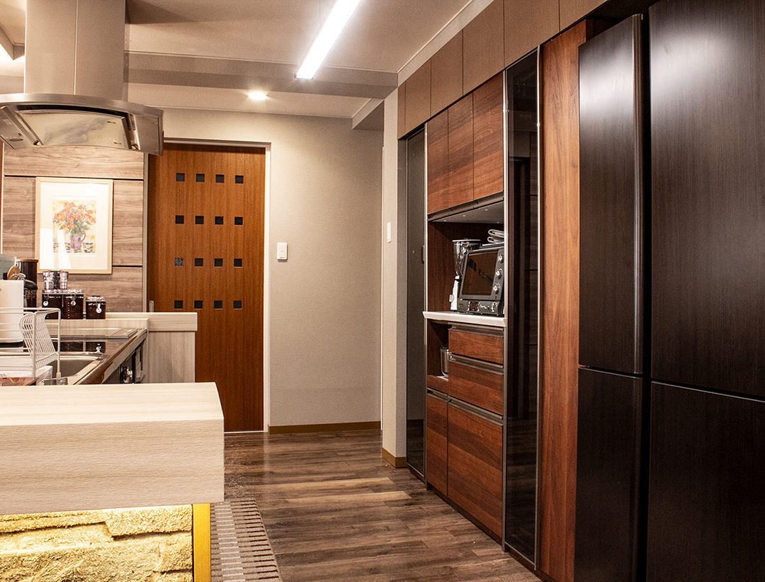 22ぴったりサイズで綺麗に収まったキッチンボードと冷蔵庫