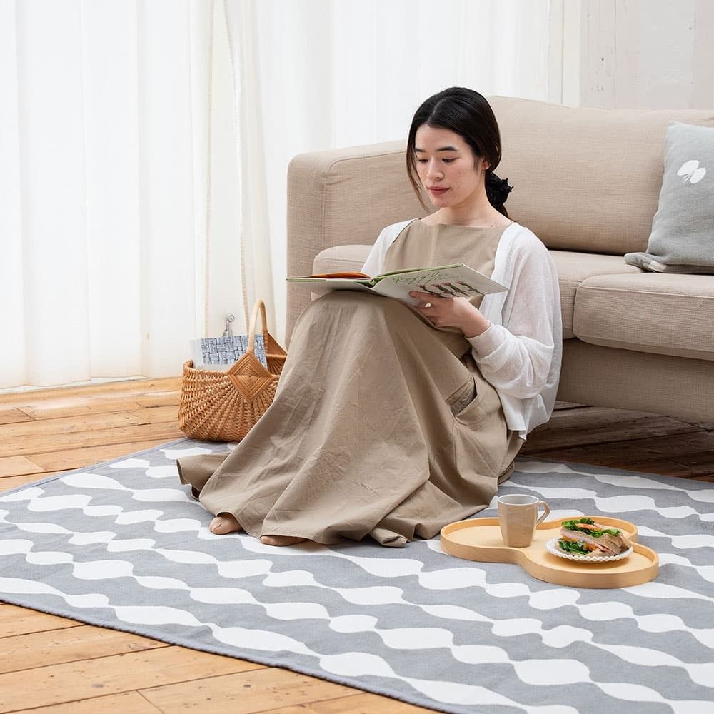 シングルサイズのコットンブランケットの意外な使い方は「ラグ」。適度な厚みとへたらない織りが、ラグとしての役割をしっかり果たします。ループがないので、ワンちゃんネコちゃんがいるご家庭でも爪を引掛ける心配がなくご利用いただます。
