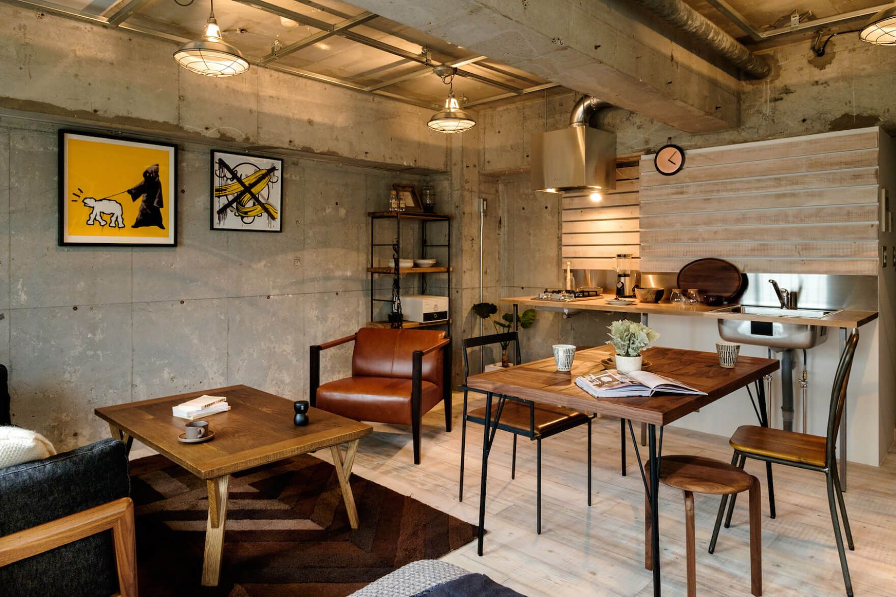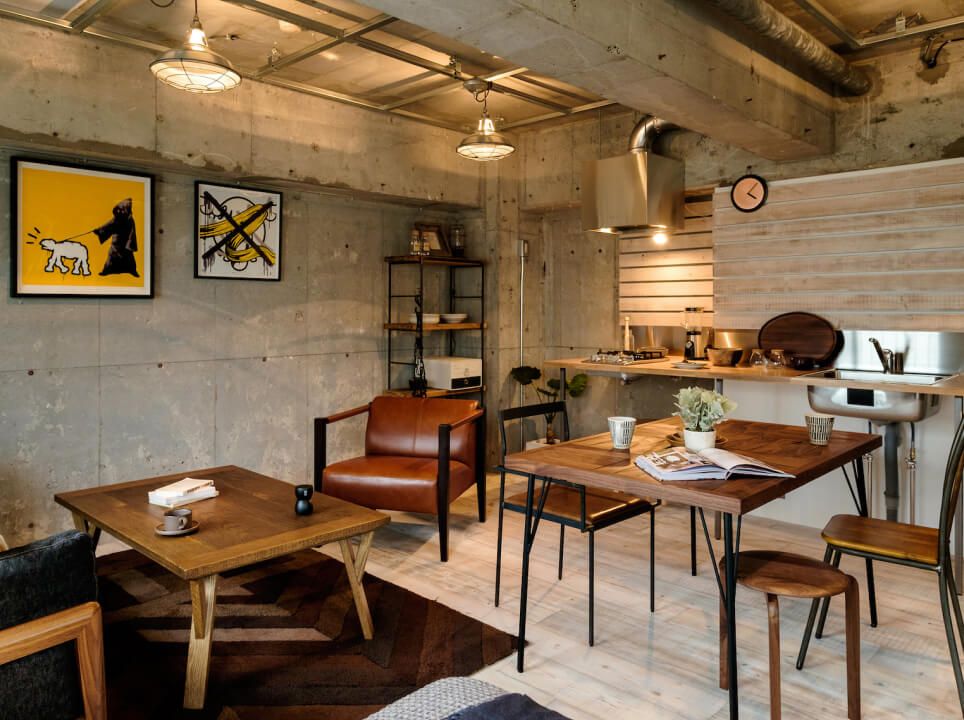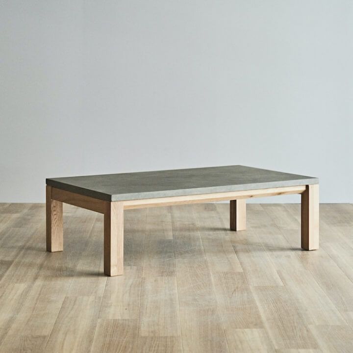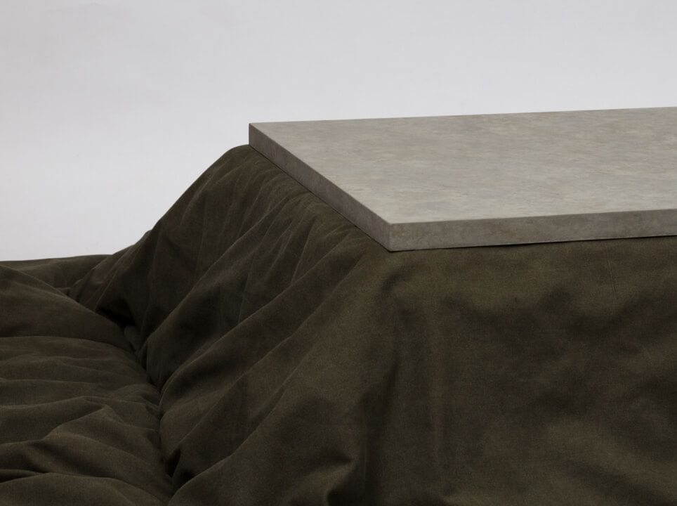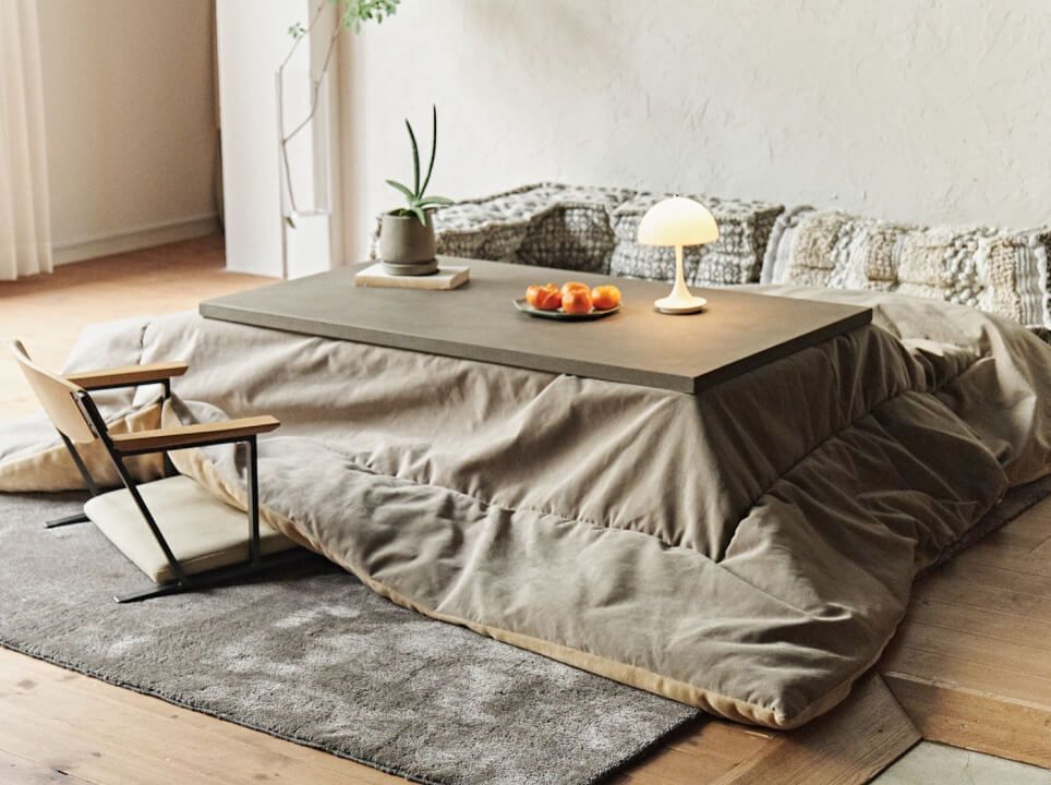 こたつリビングを都会的で洗練された印象に仕上げる、モルタル調天板のこたつ。まるで左官職人の手仕事のようなムラ感やザラッとした質感を、特殊塗装でリアルに再現しています。