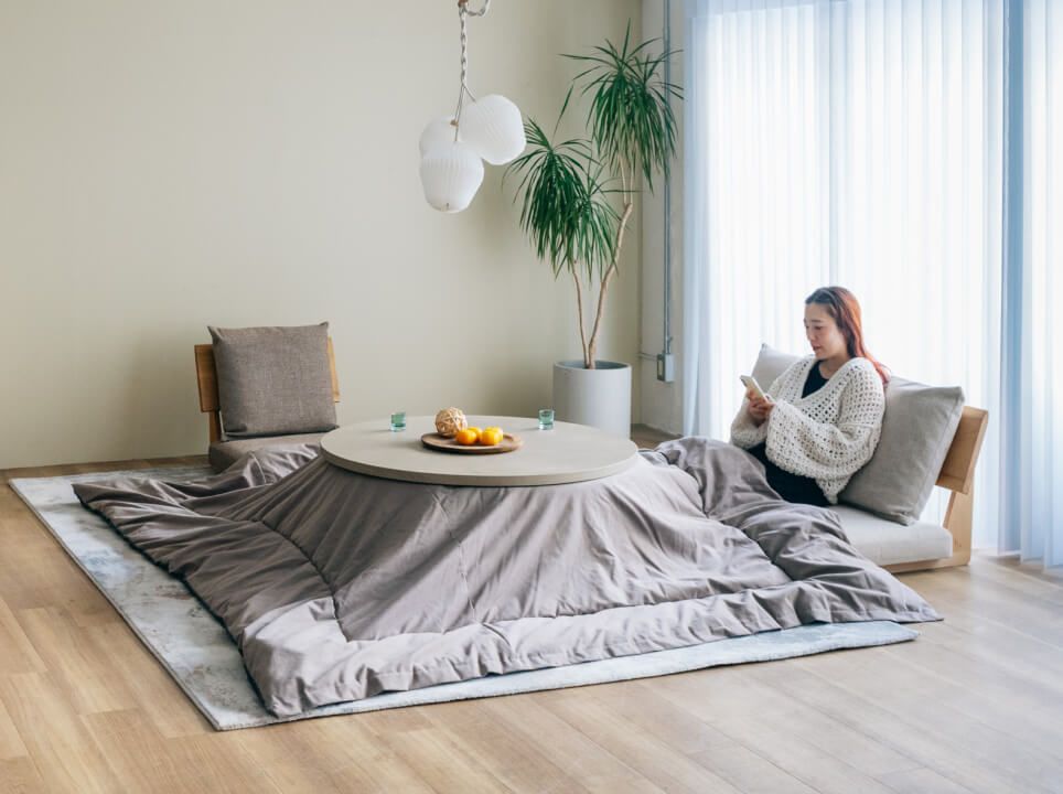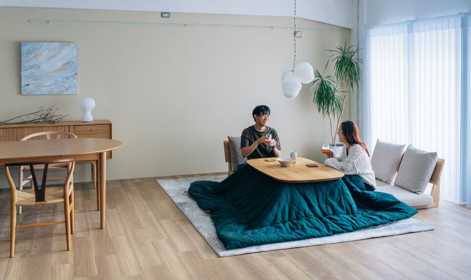 布団がない分すっきりとコンパクトになり、レイアウトの自由度もアップ。冬場とオフシーズンで配置を変えて楽しめるのも、季節によって姿を変えるこたつならではの魅力です。