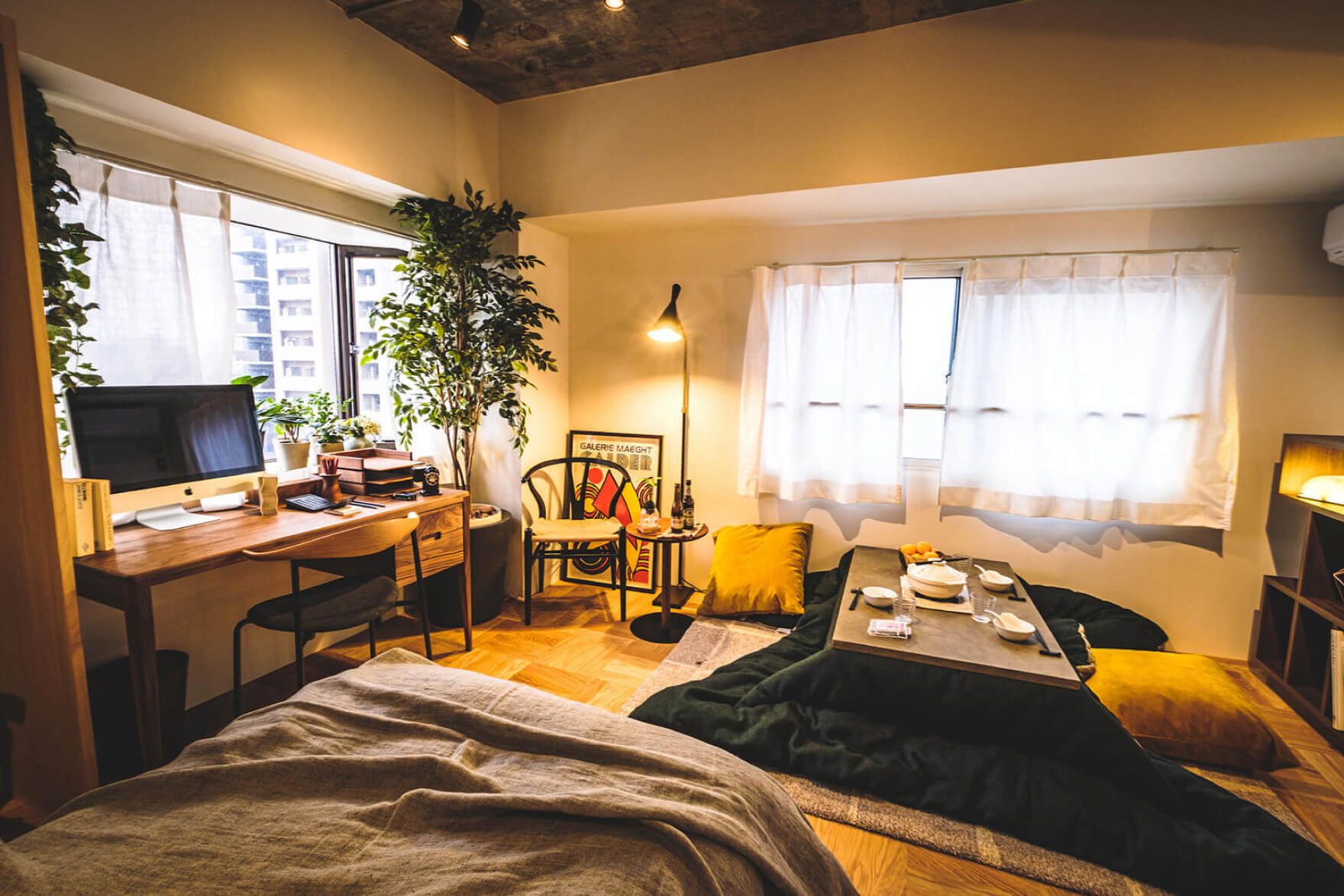 こちらもワンルームの実例です。こたつは布団を外した状態ですが、見事にお部屋に馴染んでいますね。
