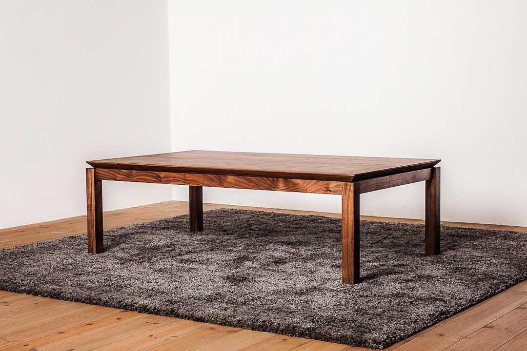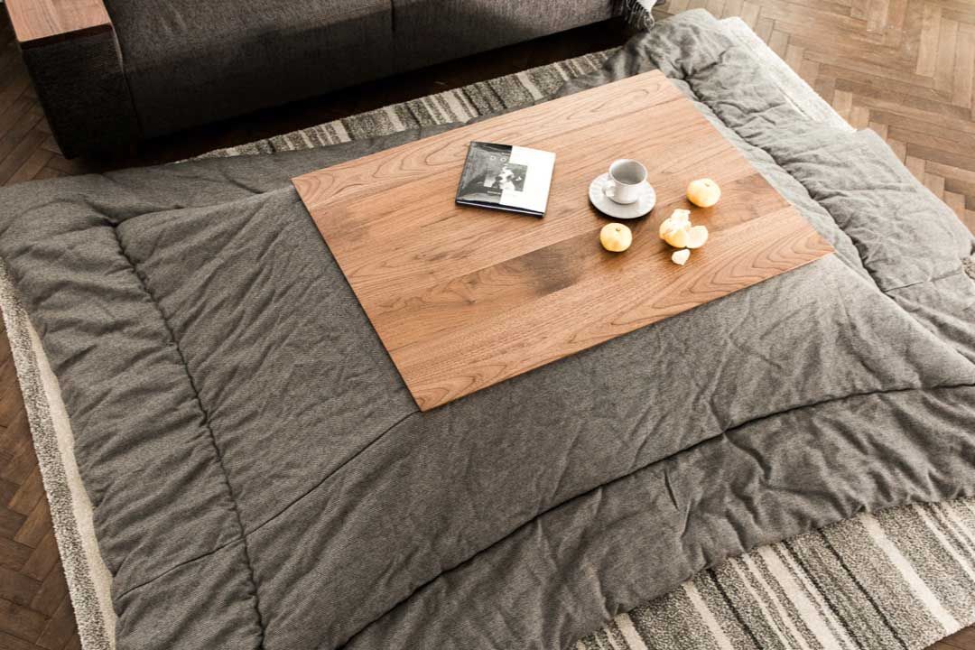 かっこよくてモダンなデザインが通年使ってもおかしくない、こたつテーブル。「こたつ=野暮ったい」というイメージを覆すべく、シャープに仕上げたデザインと、こたつではなかなかない、無垢材オイル仕上げにこだわったリビングテーブルです。