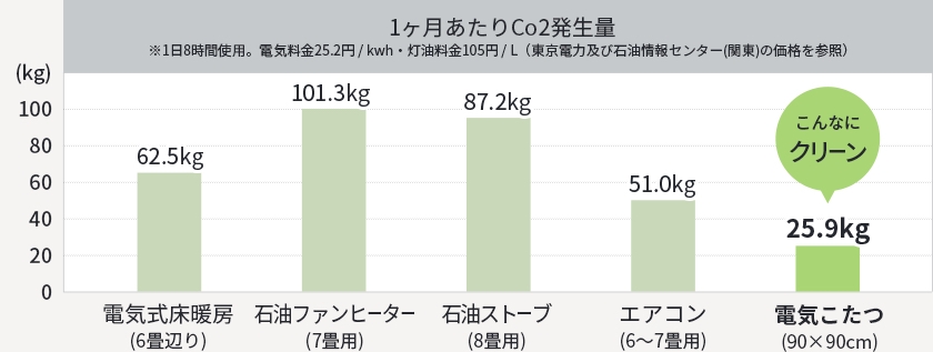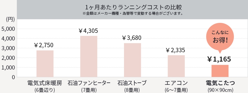 電気代がかかりそうに思えるこたつですが、実は他の暖房器具と比べてもかなり抑えめ。