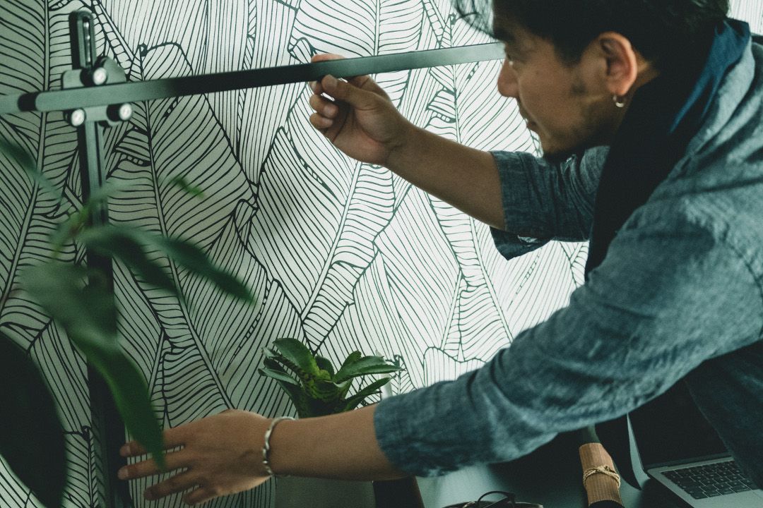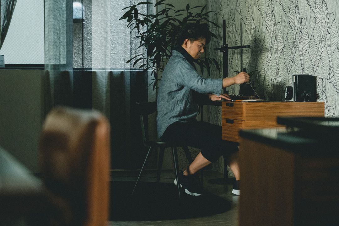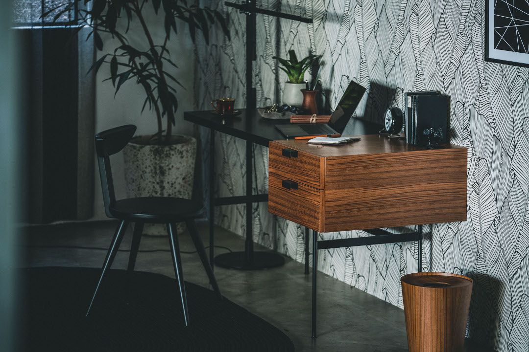 スタイリング的にはあえて、木天板の部分に黒系の小物を、黒のところにウッド系のブラウンのものを置いてみました。黒い部分に黒いものを置いてしまうとあまり目立たないし、ウッド部分にウッド系のものを置いても目立たないので、逆にして。あとは、デスクライトじゃなくてフロアライトを組み合わせるっていうのも変化がついていいんじゃないかなと思って今回トライしました。デスクにはデスクライトじゃないと、っていう決まりは別にないですし、ジェイクダイソンの照明はこの水平垂直の細いラインがこのデスクによく合いますね。(窪川さん)