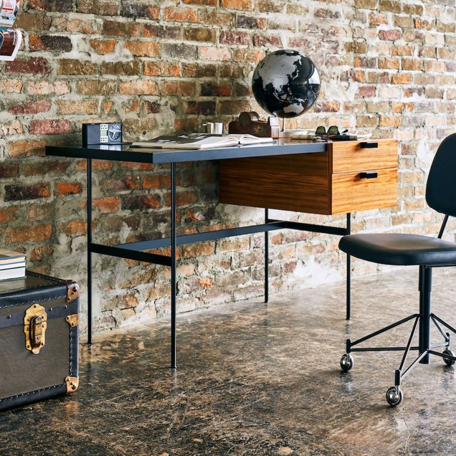 いわゆる名作家具って色々ありますけど、デスクの名作っていったら多分真っ先に出てくるのがこのピエール・ポランのデスクだと思うんですよ。比較的シンプルなデザインなんだけど、こいつがすごいなと思うのは、やっぱりこのバイマテリアルというか、バイカラーというか、ウッドの部分とブラックの部分の組み合わせだと思っていて。この組み合わせになっていることで、スタイリッシュでクールな感じにも合うし、温もりのある感じにも合わせやすい。どっちの方向でもまとめられるんです。