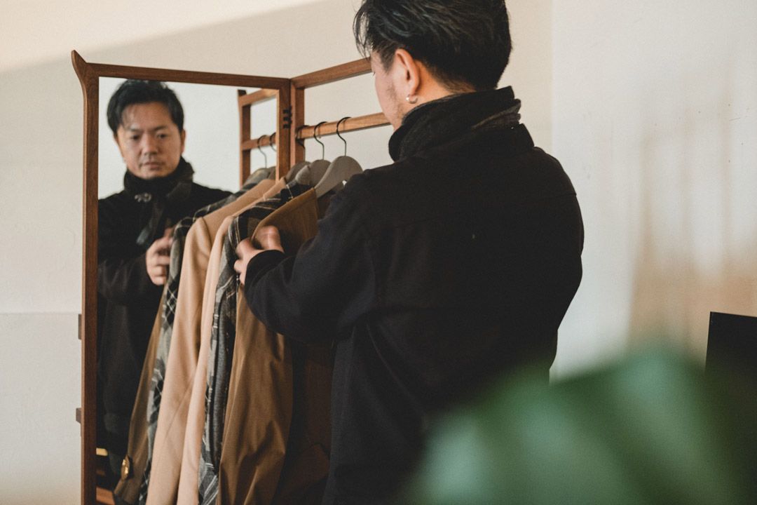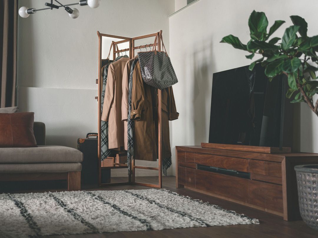 で、インテリアって、なんか壁がさびしいからポスターでも貼ろうかな、みたいなことを考えがちなんですけど、そういうやり方がある一方で、普段使ってるアウターやバッグ、スーツケースみたいな、自分のファッションアイテムをインテリアの一部としてみせるっていうやり方もあって。このハンガーラックはそんなふうに、ファッションアイテムをインテリアアイテムに昇華してくれる、そんな効果も期待できるアイテムだと思います。