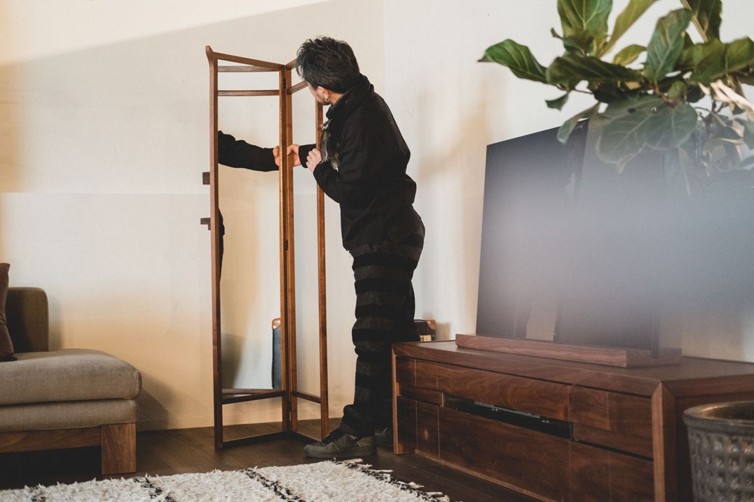 空間って基本的には70〜80cmくらいの高さまでにだいたいの家具がおさまってしまって、あとは高い位置にペンダントライトがあるくらい。だから、意識してあげないと80cmくらいから上の中間層がスパッと空いてしまうんです。なので、アートを飾るとか、80cmより高い観葉植物やスタンドライトを置いたりして中間エリアを埋める、装飾してあげるっていうのが重要。このハンガーラックなら、空いてしまいがちな中間のエリアも程よい高さとバランス感で補ってくれます。(窪川さん)