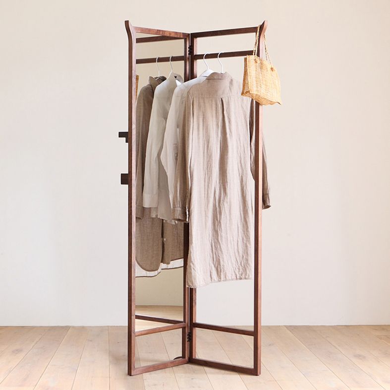 「SPAGO」とはイタリア語で「紐」 の意味。伝統技術の紐蝶番と高いデザイン性を融合させたハンガーラックです。鏡が組み込まれているので姿見にもなり、さらに、鏡の裏側には小物入れも。デイリーユースの服やアクセサリー、鍵などをこれひとつにまとめておくことができます。上部の角はフックのようになっていて、鞄やストールを掛けておくことが可能。オイルで仕上げた無垢材のフレームは、天然木本来の温かみや風合い、手触りを存分に味わえます。