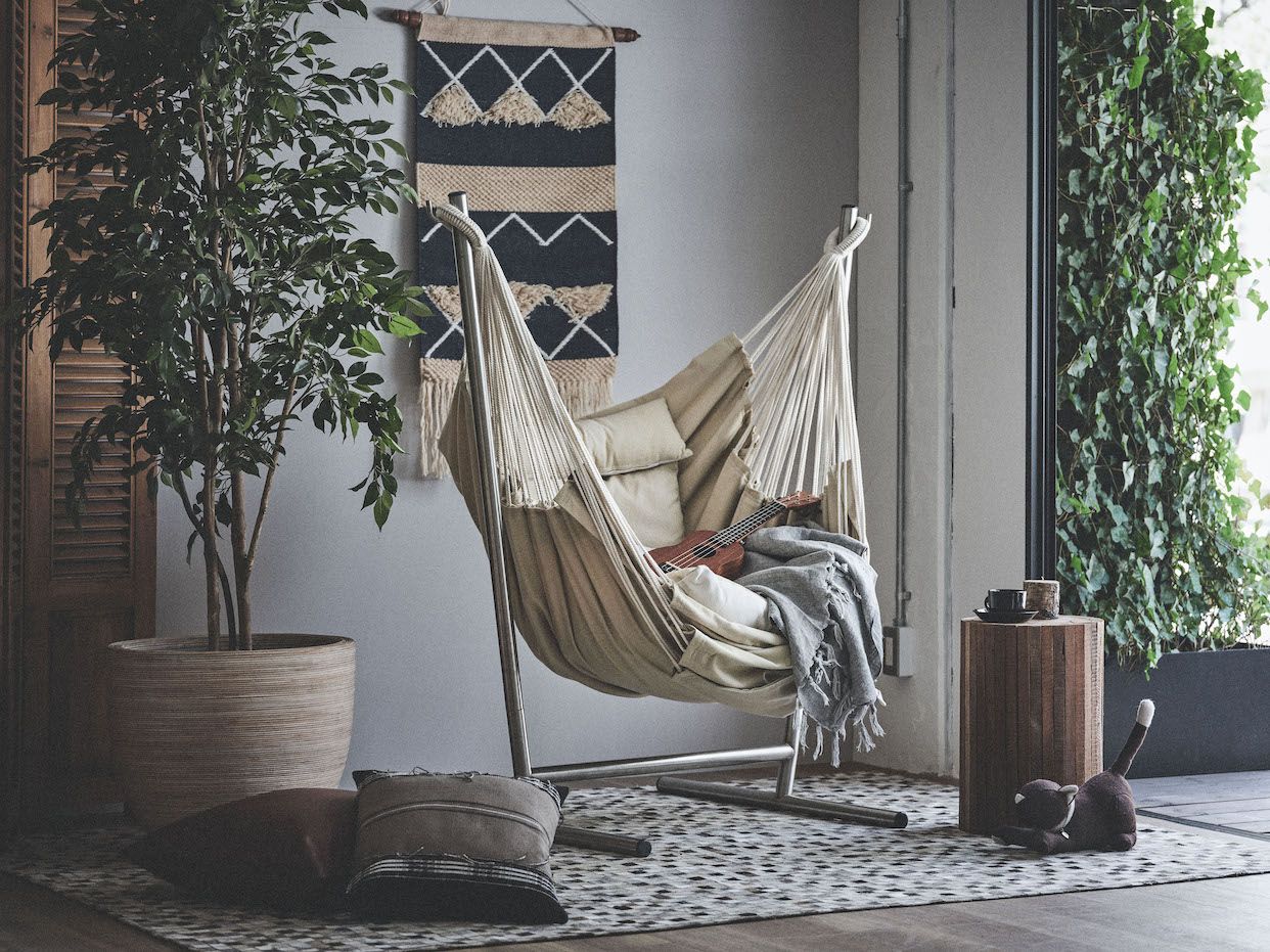 こういうハンモックチェアっていかにお部屋に溶け込ませるかが大事だと思ってたけど、ゾーニングするのか。勉強になります。持ち運びができるパーテーションだから気軽に配置換えできるし、壁みたいに完全に隔てているわけではなく上が抜けてるからそんなに圧迫感も感じない。ベランダとかテラスには出せないって言う方でも、フィイクグリーンとかウッド調の物を置くだけでも雰囲気変わるなと思った。私もここでパソコン持って仕事したーいと思わせてくれるぐらいの居心地のよさでした。(スタッフ:まる)