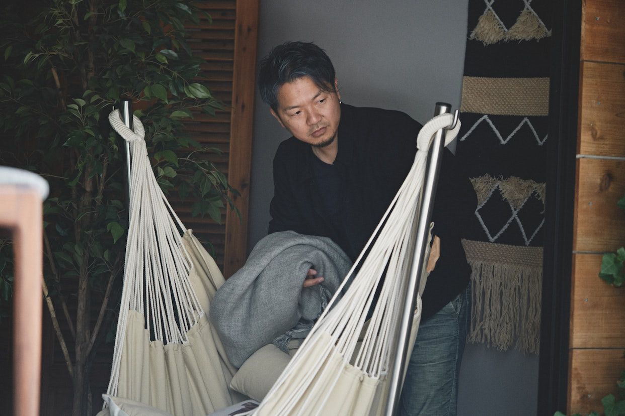 ハンモックってくつろいでもいいしこのままうたたねしてもいいようなチェアだよね。前回の(Vol14)のラウンジチェアの時と同じで、自由な角度で置ける家具ってすごい限られてるんですよ。例えばサイドボードとかシェルフとかソファとか、壁に付けたりするのが基本になっている家具が多い中で自由度が高く置けるし、こういう物があると空間に動きが生まれる。少し置けるスペースがあればどこの空間に置いてもいいですよね。
