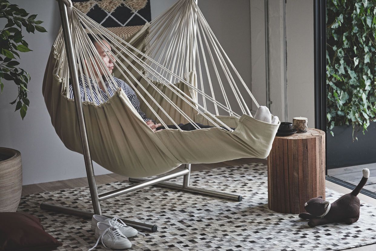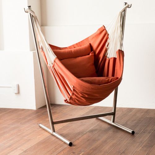 スペイン南部セビリアの職人がハンドメイドで編み上げた一人掛けハンモック。ハンモックと言うとどこかに穴を開けて吊るしてどうしよう・・・と考えなければいけないイメージですが、ステンレスのスタンド付きなので、工事は不要!スペースさえ確保していただければ場所を選びません!スタンドは見た目とは異なりとっても軽量で工具不要で組み立て・分割が可能となっています。気軽に移動できるので置く部屋を変えてもよし、車に積んでピクニック・キャンプのお供にもよし。家族の一員として迎えてあげてください。成人男性でも脚を伸ばすことができる仕様となっております。背・座クッションと枕がそれぞれ同色の生地で付属しております。