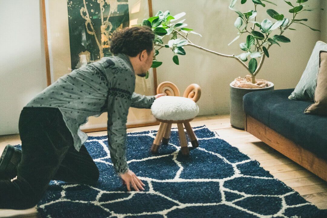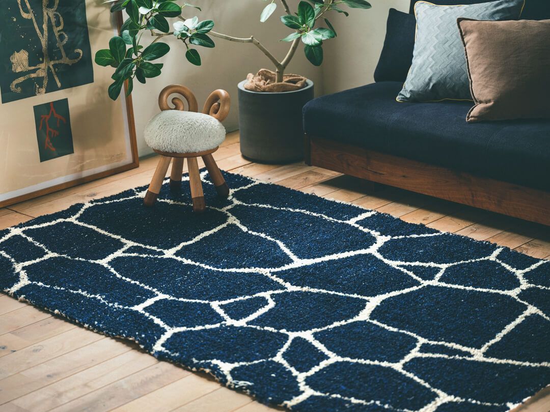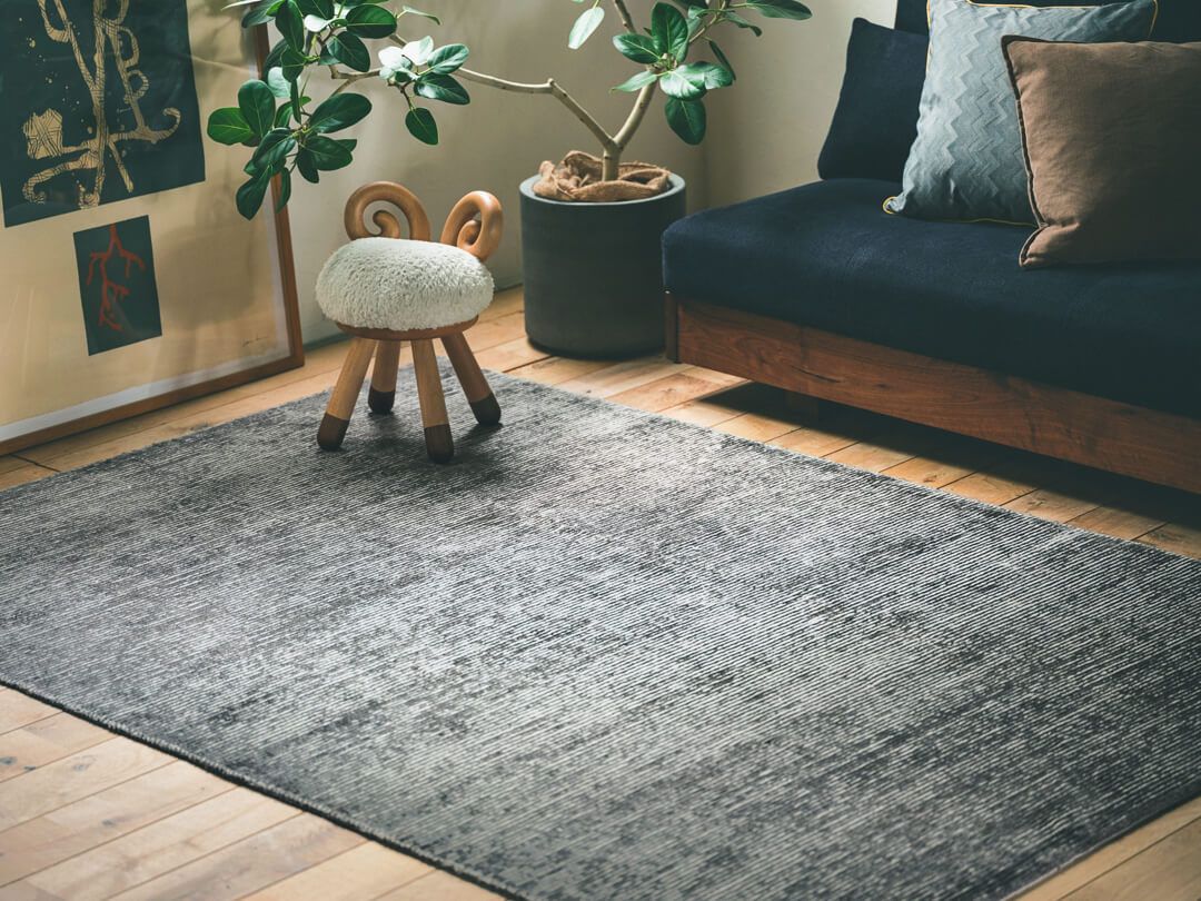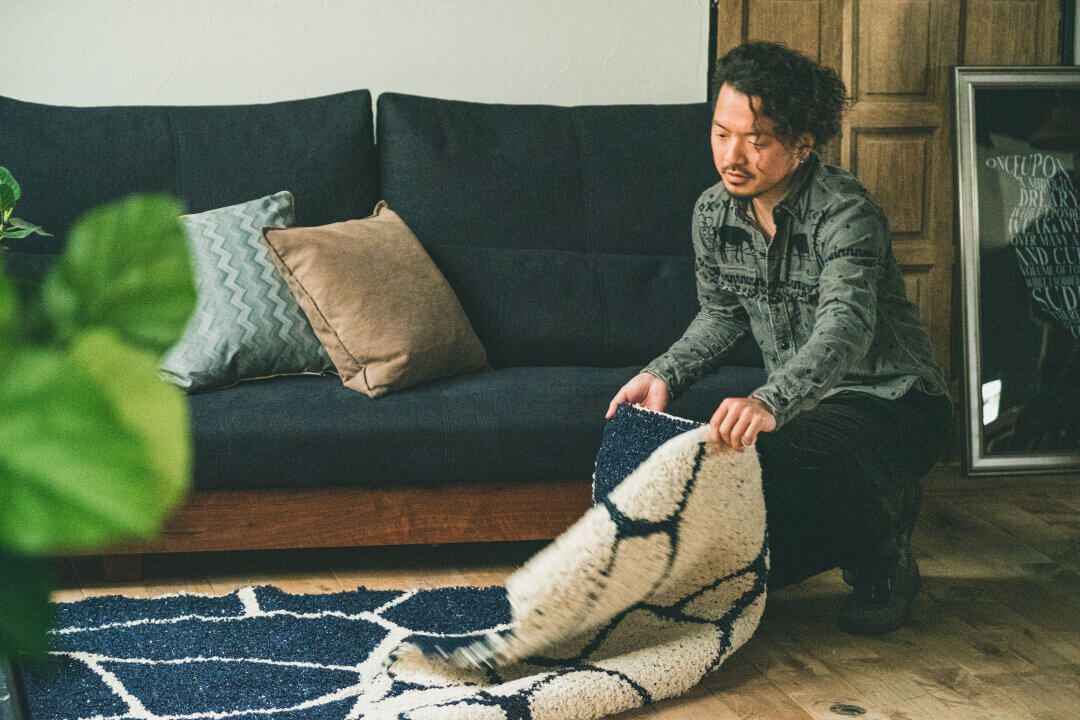 なにか部屋を変えてみたいなって思っている人いっぱいいると思うんですけど、家具を買い替えようとなると、それなりの決心がいるし、まとまった出費にもなりますよね。それに、もちろんソファみたいな大きな物を買い替えたりすれば部屋は変わるんだけど、やっぱり一歩目としてはハードルが高いんじゃないかなと思います。なので今回は、もっと気軽に取り入れられて、なるべく大きな出費なく部屋の雰囲気をガラッと変えてくれるアイテムとしてラグを選びました。ラグとか、カーテン、寝室だったらベッドカバーみたいなものもそうなんですけど、広い面積を占めるものを変えるはすごく効果的なんです。部屋の変化率が大きいというか。床って、カーペットにしたいなとか、フローリングにしたいな、打ちっぱなしにしたいなって思っても、できないじゃないですか。だから、ラグ。ラグだったら一枚買い足しするだけで床の雰囲気をガラッと変えてくれます。まあ、家具屋さん的には家具が売れてくれないと困ると思うんだけど…(笑)