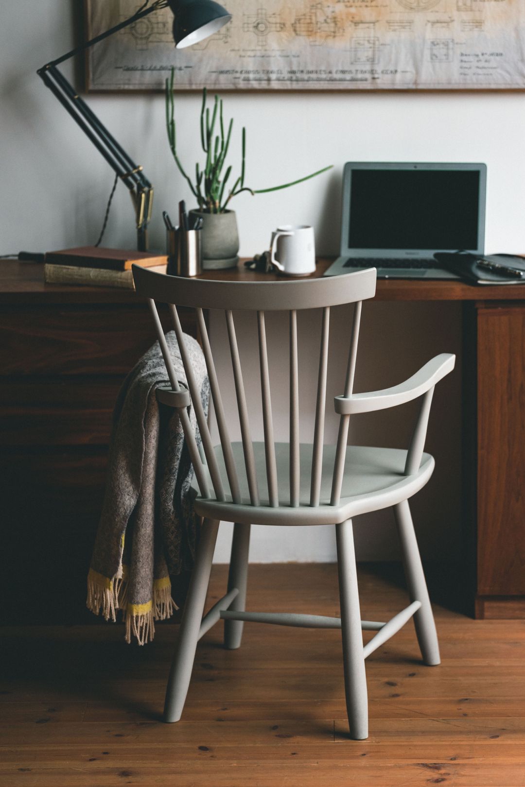 もちろんダイニングとかもそうだし、家でがっつり仕事する人じゃなければ、これをちょっと作業時の椅子として使ってもらってもいいので、ダイニング以外の場所でも活躍してくれるんじゃないかなと思って二つの表情を作って見ました。アームがある事で普通に寛ぎ感もプラスされるし、更にデザイン性もプラスされていて、ちょっと北欧の雰囲気を出す為のブランケットみたいな物をアームに掛けておけます。あとは背が抜けるタイプの椅子っていうのは、背が抜けないタイプの椅子に対してあんまり空間に圧迫感を与えないっていうか、抜け感があるのでそんなに重くならないっていう特徴もありますよね。