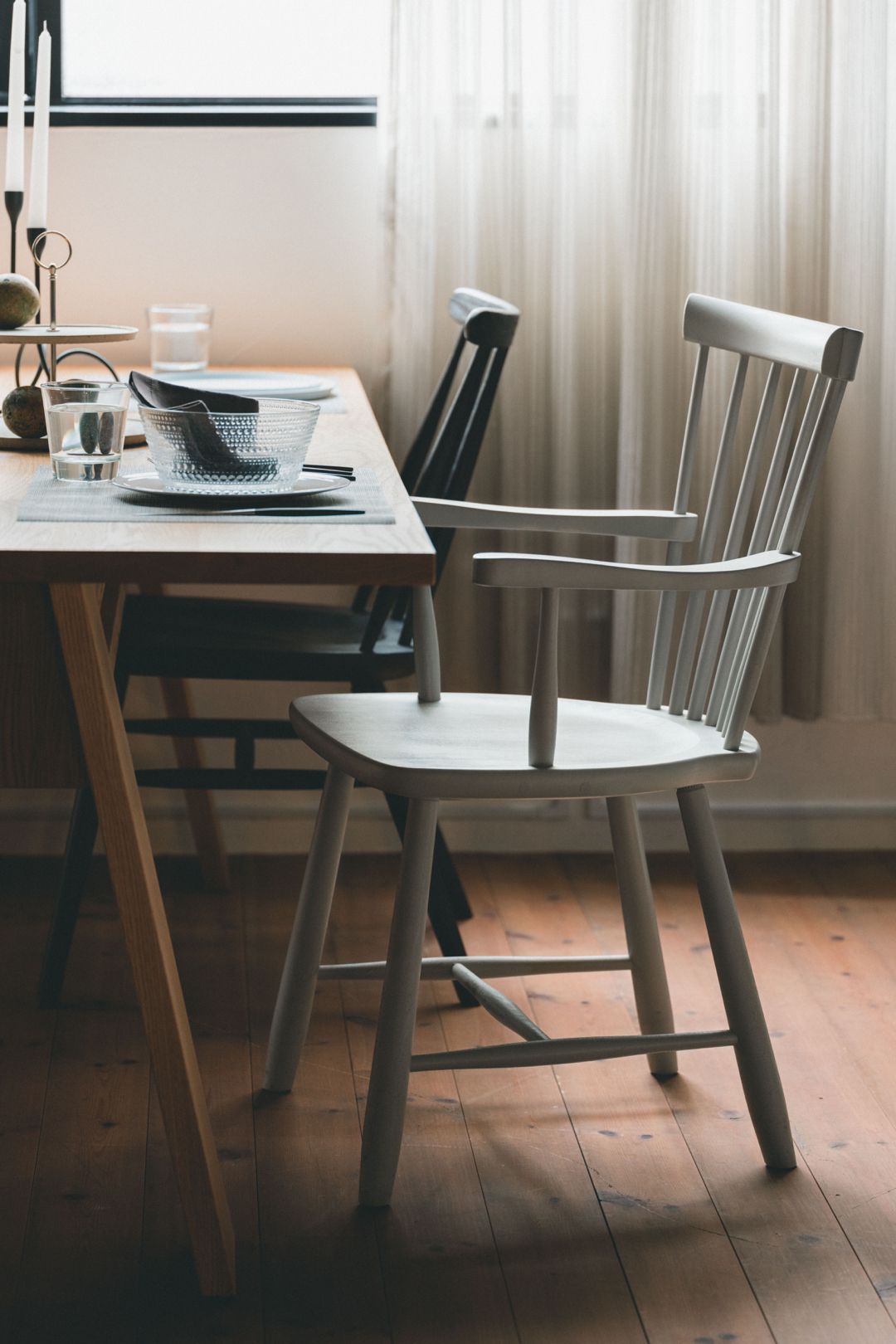 北欧家具って人気のアイテムで、しかも全体的にペール系の彩度を低いトーンで揃えるインテリアって一つのトレンドなんですよね。結構ダイニングテーブルとかもグレイッシュな感じというか、あまり色の深くないものを組み合わせて見たんですけど、そういう低彩度の空間を作るのに適した椅子じゃないかなと思っています。