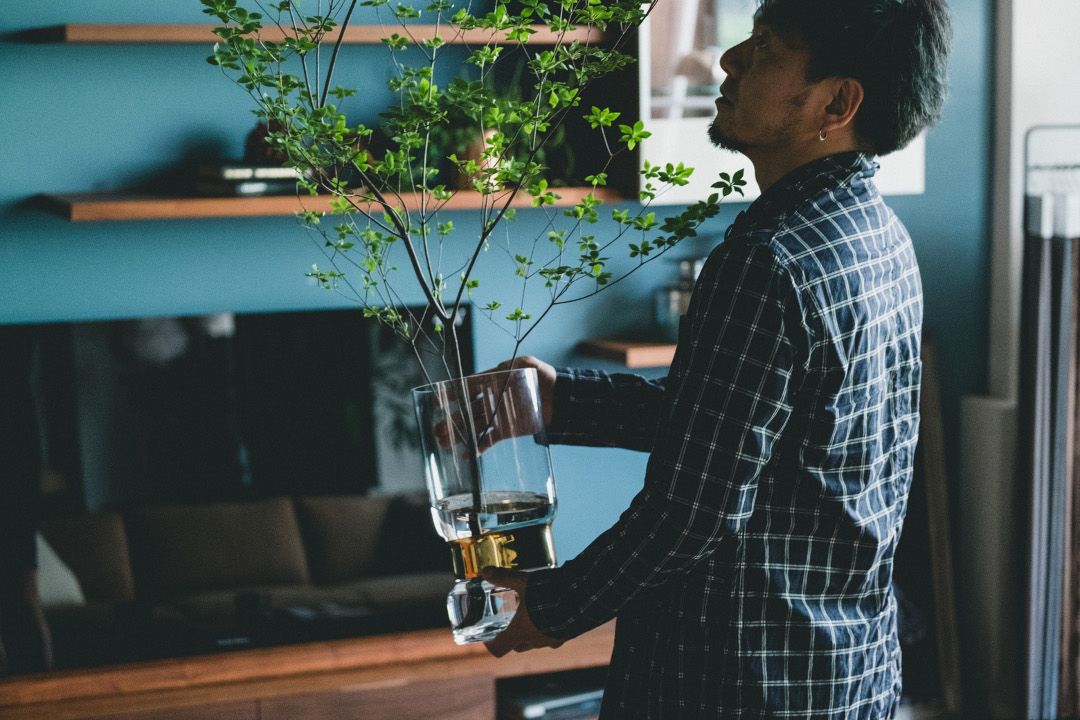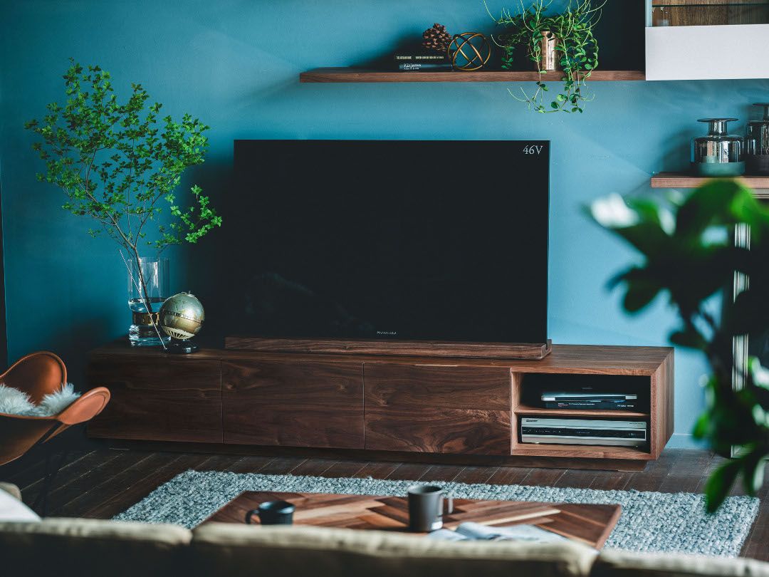 あとは、ただ大きなテレビを置くだけで終わるんじゃなくて、好きなオブジェとかでアレンジしたりすると良いですね。今46インチ(テレビ)が載ってますけど、これが60インチでもまだ両サイドに物を置けるスペースができると思います。今回はドウダンツツジを置いたり。僕は家でも枝物を結構使っていて、枝物って花よりも長持ちするのでズボラな人向けだったり…というか、花を買うよりもコストパフォーマンス良く部屋を激変させてくれるアイテムなので、枝物を取り入れてみるのもおすすめかなと思います。(窪川さん)