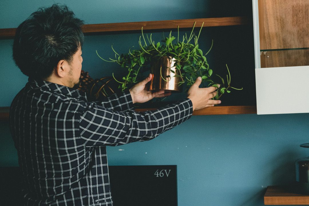 ぱっと見るとすごいシンプルなボードなんだけど、ちゃんと(扉の)木目が続いてるところとか、ここ(デッキ収納部棚板)も角度がつけてあってすっきりみせていたり、シンプルなデザインの中に考えられている要素があるよね。まずやっぱりこういうスタンダードなものはずっと長く使い続けられる。で、無垢の木は使っていくうちに良い感じにエイジングというか、馴染んでいくんだけど、その木の馴染んだ感じと合う鈍いゴールドとか、ゴールド系のアイテムをアクセントで散らしてみました。真鍮や銅みたいな素材感のものって、例えばステンレスなんかと比較すると金属だけど温もり感があるので、こういう上質なウッド系のものと相性が良いです。