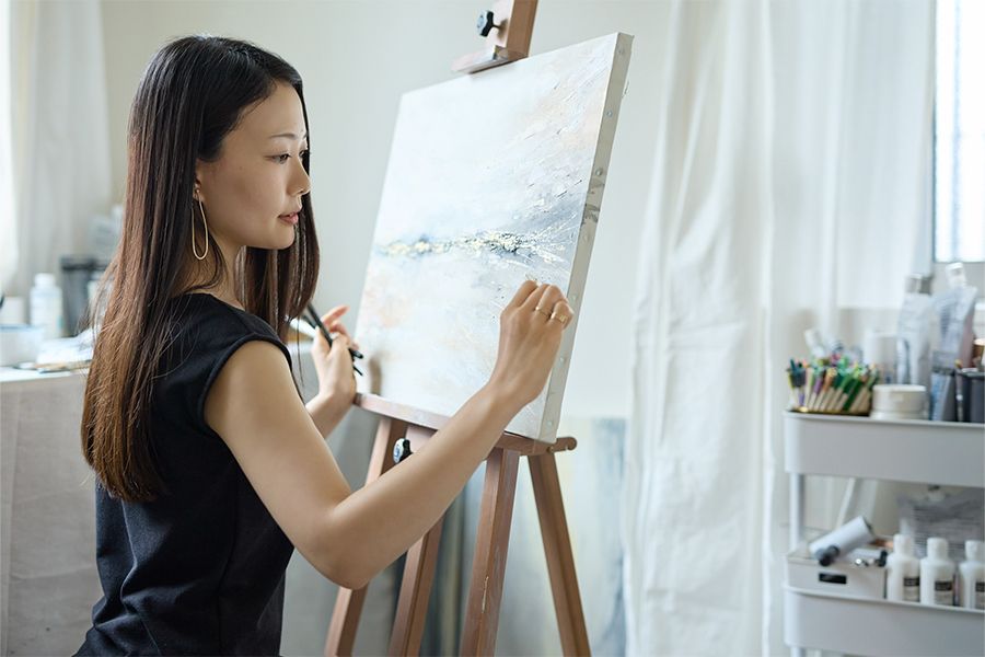1993年東京生まれ。オランダ、イギリスへの留学を経て、現在は東京で活動中のアーティスト。幼少期より自身がつらい経験をしたときに無意識に創作に打ち込んできた。描いていたのは、実在しない、理想の美しい世界。やがて、自身が苦しかった時にアートに救われてきたことに気付き、ポジティブなエネルギーや癒しを与える作品を描き続ける決意をする。2021年、コロナ禍を機に会社員から画家に転身。国内外で展示、ホテル、オフィス、個人邸宅等に納品多数。心の奥にある「美学」や「感性」と向き合う作品を創りつづける。3歳、1歳児の母。