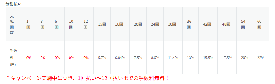 現在、キャンペーン実施中につき、1回払いから12回払いまで手数料無料。